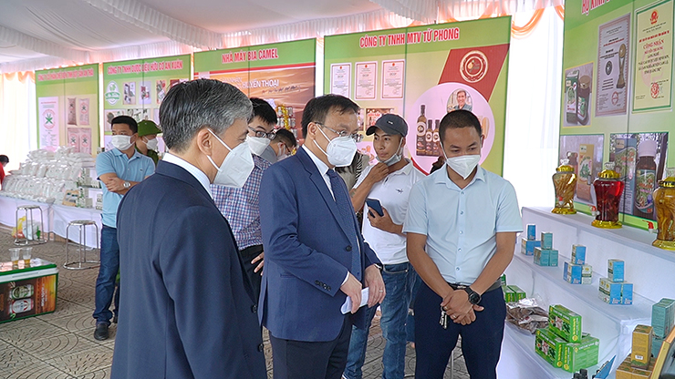 Các đại biểu tham quan gian hàng trưng bày sản phẩm có thế mạnh của huyện Cam Lộ