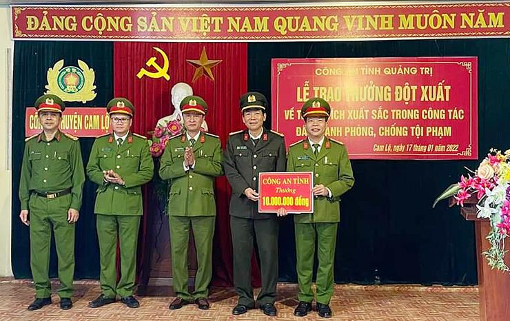 Phó Giám đốc Công an tỉnh, Đại tá Trần Xuân Vĩnh trao thưởng cho Công an huyện Cam Lộ