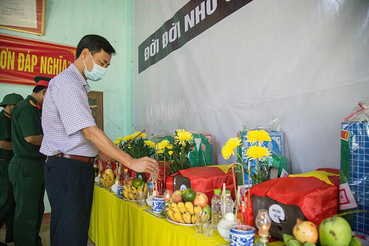 Phó Chủ tịch UBND huyện Nguyễn Thanh Bắc dâng hương tưởng niệm các anh hùng liệt sỹ vừa được tìm thấy tại thôn Mai Trung, xã Cam Chính