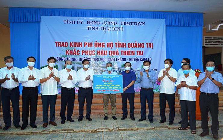Tại buổi trao kinh phí, Phó Bí thư Thường trực Tỉnh ủy, Chủ tịch HĐND tỉnh Thái Bình Nguyễn Tiến Thành chia sẻ, tỉnh Thái Bình và tỉnh Quảng Trị đã có mối quan hệ tình cảm gắn kết, bền chặt từ trong những năm tháng chiến tranh cho đến ngày hôm nay. Phát huy truyền thống tốt đẹp đó, khi biết tỉnh Quảng Trị phải hứng chịu những thiệt hại to lớn do thiên tai, bão lũ trong năm 2020, cán bộ và Nhân dân tỉnh Thái Bình đã vận động đóng góp các nguồn lực và đã có nhiều đợt hỗ trợ tỉnh Quảng Trị kịp thời khắc phục hậu quả thiên tai, khôi phục cuộc sống; đặc biệt trong đó là sự ủng hộ 5 tỉ đồng để xây dựng Trường Tiểu học Cam Thành. Phó Bí thư Thường trực Tỉnh ủy, Chủ tịch HĐND tỉnh Thái Bình mong rằng công trình trường học này sẽ là món quà tặng ý nghĩa, như là biểu tượng cho tình cảm tốt đẹp và nghĩa tình bền chặt giữa tỉnh Thái Bình và Quảng Trị.