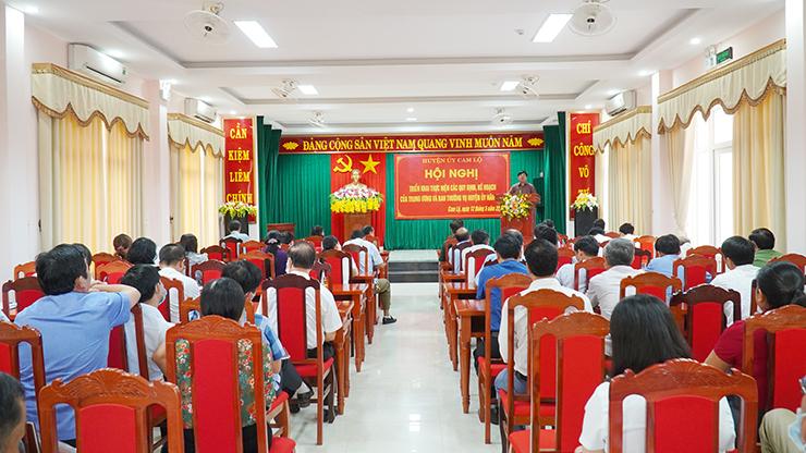 Hội nghị đã quán triệt Quy định số 58 của Bộ Chính trị về “Một số vấn đề bảo vệ chính trị nội bộ Đảng”; các quy định của Ban Thường vụ Huyện ủy Cam Lộ về phân cấp quản lý cán bộ; bổ nhiệm và giới thiệu cán bộ ứng cử; quy hoạch cán bộ; kế hoạch thực hiện Kết luận số 21 của BCH Trung ương Đảng về đẩy mạnh xây dựng, chỉnh đốn Đảng và hệ thống chính trị; kiên quyết ngăn chặn, đẩy lùi, xử lý nghiệm cán bộ, đảng viên suy thoái về tư tưởng, chính trị, đạo đức, lối sống; những biểu hiện “tự chuyển biến”, “tự chuyển hóa”; kế hoạch thực hiện Chỉ thị số 19 của BTV Tỉnh ủy Quảng Trị về đại hội chi bộ trực thuộc đảng ủy cơ sở và bầu trưởng thôn, bản, khu phố nhiệm kỳ 2022-2025.
