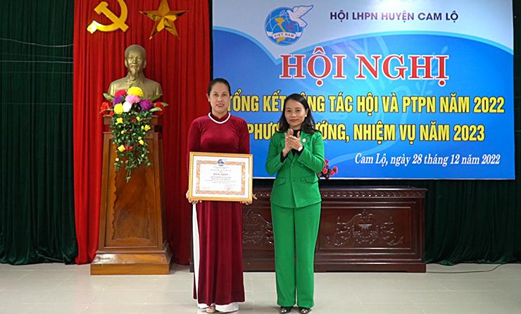 Chủ tịch Hội LHPN huyện Lê Thị Hường trao giấy khen cho các tập thể có thành tích xuất sắc trong phong trào phụ nữ năm 2022