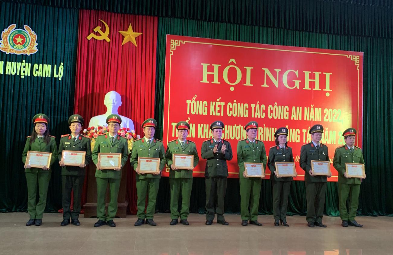 Năm 2022, Công an huyện Cam Lộ đã thực hiện tốt chức năng tham mưu, giải quyết kịp thời các vấn đề phức tạp liên quan đến an ninh kinh tế, an ninh tôn giáo, an ninh xã hội, giữ vững an ninh chính trị trên địa bàn. Công tác đấu tranh phòng chống tội phạm được tăng cường, kiềm chế gia tăng các loại tội phạm. Đã điều tra, làm rõ 44 vụ phạm tội liên quan đến trật tự xã hội, đạt tỷ lệ 97,7% ; phát hiện, bắt giữ 11 vụ/ 14 đối tượng phạm tội về kinh tế; điều tra làm rõ 13 vụ về ma túy, bắt giữ 25 đối tượng…Triển khai thực hiện 2 Dự án dữ liệu quốc gia về dân cư; sản xuất, cấp, quản lý CCCD và Đề án 06 về phát triển ứng dụng dữ liệu về dân cư, định danh và xác thực điện tử phục vụ chuyển đổi số quốc gia giai đoạn 2022-2025 tầm nhìn đến 2030 đảm bảo tiến độ đề ra. Công tác xây dựng phong trào toàn dân bảo vệ an ninh Tổ quốc có nhiều đổi mới, huy động được sức mạnh toàn dân trong công tác đảm bảo an ninh trật tự tại địa bàn cơ sở.