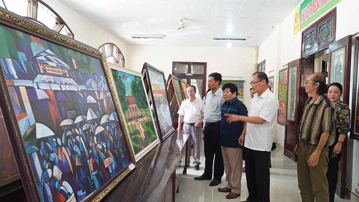 Các đại biểu tham quan phòng tranh tại Trại sáng tác mỹ thuật “Đất và người Cam Lộ”