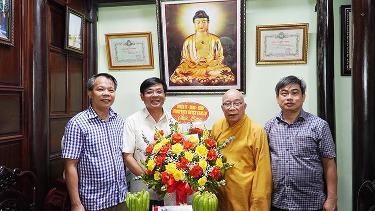 Bí thư Huyện ủy Đỗ Văn Bình và lãnh đạo huyện tặng hoa chúc mừng Hòa thượng Thích Thiện Tấn, Trưởng Ban Trị sự GHPGVN tỉnh