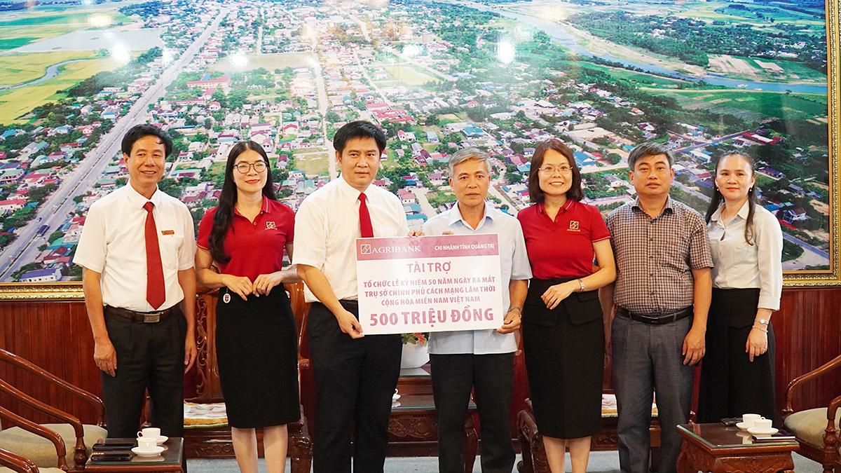 Vừa qua, thừa ủy quyền của Ngân hàng nông nghiệp (Agribank) Việt Nam, lãnh đạo Agribank Quảng Trị đã trao kinh phí hỗ trợ 500 triệu đồng cho huyện Cam Lộ tổ chức lễ kỷ niệm 50 năm ra mắt Trụ sở Chính phủ Cách mạng lâm thời Cộng hòa miền Nam Việt Nam. Tham dự buổi trao quà hỗ trợ có đồng chí Phan Hồng Hải, Bí thư Đảng ủy, Giám đốc Agribank Quảng Trị; đồng chí Trần Anh Tuấn, Phó Bí thư Huyện ủy, Chủ tịch UBND huyện Cam Lộ.
