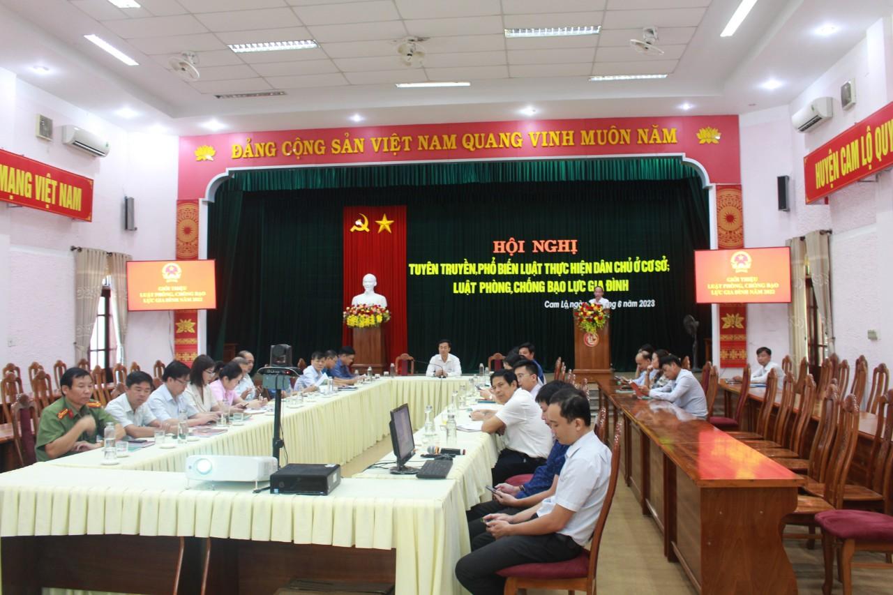 Ngày 21/6/2023, huyện Cam Lộ tổ chức hội nghị trực tuyến tuyên truyền, phổ biến Luật Thực hiện dân chủ ở cơ sở và Luật Phòng, chống bạo lực gia đình cho lãnh đạo các phòng, ban, ngành, tổ chức chính trị -xã hội; cán bộ, công chức các xã, thị trấn trên địa bàn huyện.