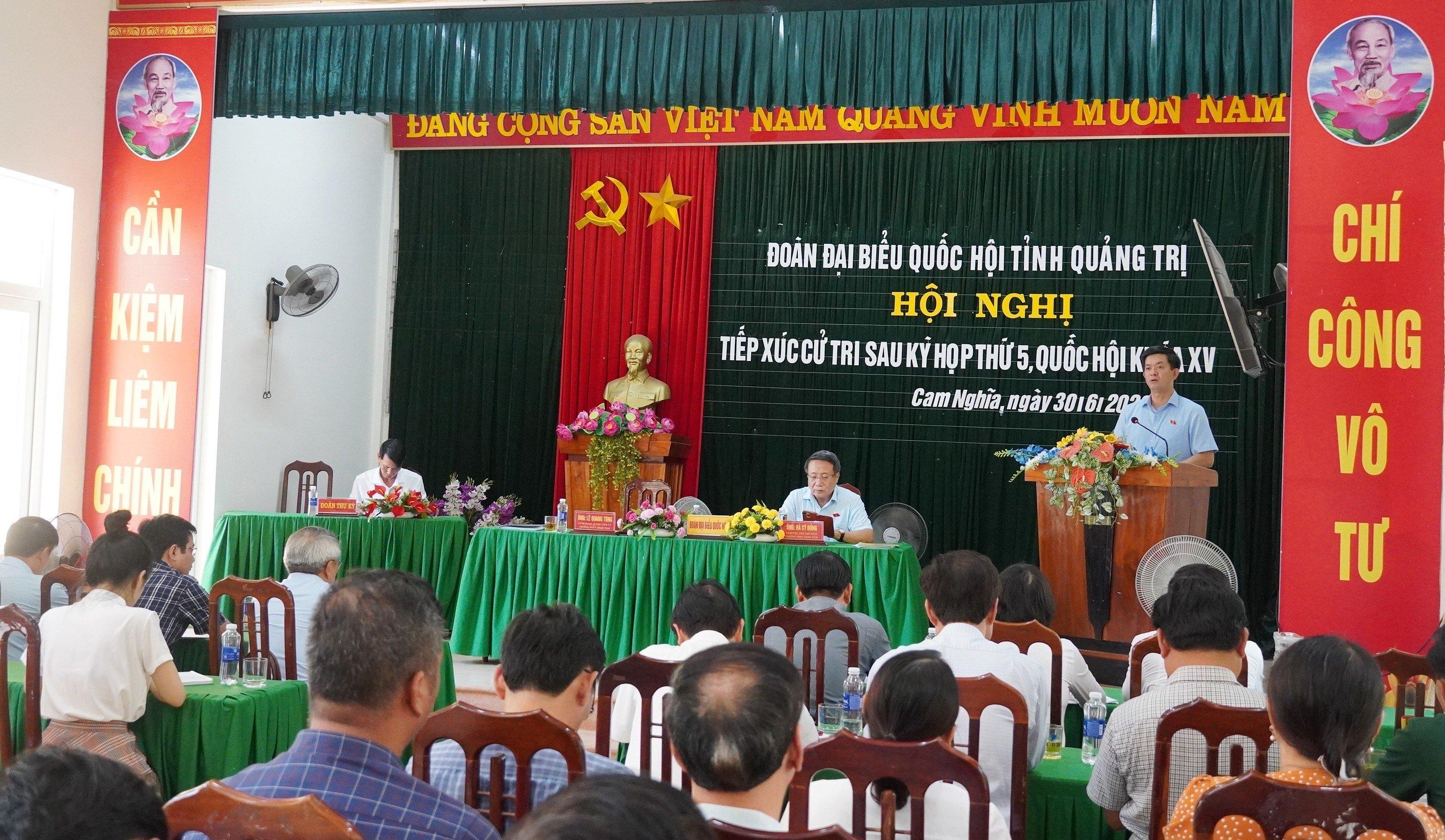 Sáng ngày 30/6/2023, Đoàn đại biểu Quốc hội (ĐBQH) tỉnh gồm: UVTƯ Đảng, Bí thư Tỉnh ủy, Trưởng Đoàn ĐBQH Lê Quang Tùng và Phó Chủ tịch Thường trực UBND tỉnh Hà Sỹ Đồng đã có buổi tiếp xúc cử tri sau kỳ họp thứ 5, Quốc hội khóa XV tại xã Cam Nghĩa, huyện Cam Lộ. Tham dự buổi tiếp xúc cử tri có đại diện UBMTTQVN tỉnh; lãnh đạo các sở, ban, ngành; lãnh đạo huyện Cam Lộ.
