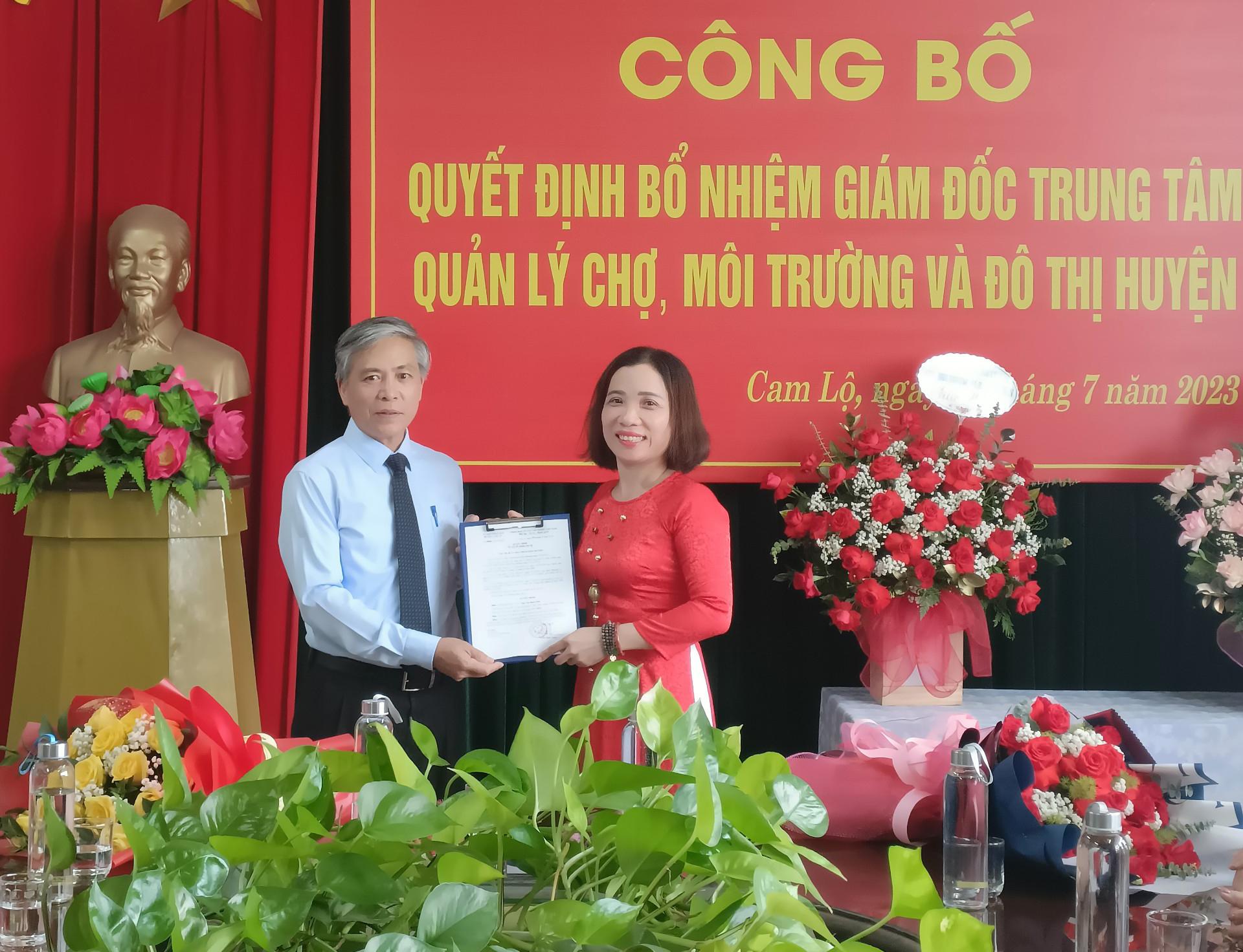 Tại hội nghị, phòng Nội vụ đã công bố quyết định của UBND huyện về việc bổ nhiệm đồng chí Ngô Thị Bạch Mai, Trưởng ban Quản lý chợ huyện Cam Lộ giữ chức vụ Giám đốc Trung tâm Quản lý chợ, Môi trường và Đô thị huyện kể từ ngày 3/7/2023, thời hạn bổ nhiệm là 5 năm.