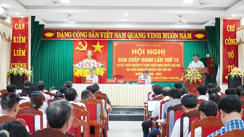 Thực hiện Nghị quyết Đại hội Đảng bộ huyện lần thứ XVI, nhiệm kỳ 2020-2025 trong điều kiện hết sức khó khăn về thiên tai, dịch bệnh COVID-19 nhưng với quyết tâm chính trị cao của cả hệ thống chính trị và Nhân dân nên nửa nhiệm kỳ qua, tình hình kinh tế-xã hội, quốc phòng-an ninh; công tác xây dựng Đảng trên địa bàn huyện Cam Lộ có bước chuyển biến tích cực, toàn diện trên tất cả các lĩnh vực. Tốc độ tăng trưởng kinh tế bình quân 3 năm ước đạt 12,7%, thu ngân sách địa phương tăng bình quân 13,1%; cơ cấu kinh tế chuyển dịch đúng hướng, công nghiệp-thương mại-dịch vụ chiếm 77,3%; kết cấu hạ tầng được đầu tư đồng bộ; tiêu chí xã nông thôn mới nâng cao đạt 109/133 tiêu chí, có 4 xã hoàn thành hồ sơ nông thôn mới nâng cao đề nghị tỉnh xét công nhận; huyện nông thôn mới nâng cao đạt 3/9 tiêu chí; 100% trường học đạt chuẩn quốc gia; duy trì 100% xã đạt chuẩn quốc gia về y tế; tạo việc làm mới cho hơn 3.800 lao động, thu nhập bình quân đầu người cuối năm 2022 ước đạt hơn 60 triệu đồng, tỉ lệ hộ nghèo dưới 3%; quốc phòng-an ninh giữ vững và ổn định; kết nạp hơn 280 đảng viên mới. Phương thức lãnh đạo của cấp ủy Đảng ngày càng đổi mới; hiệu lực, hiệu quả quản lý, điều hành của chính quyền từ huyện đến cơ sở ngày càng hiệu quả; hoạt động của mặt trận và các tổ chức chính trị-xã hội có nhiều đổi mới, thiết thực, góp phần thúc đẩy phát triển kinh tế-xã hội, tạo tiền đề, động lực để thực hiện hoàn thành các chỉ tiêu Nghị quyết Đại hội Đảng bộ huyện đề ra.