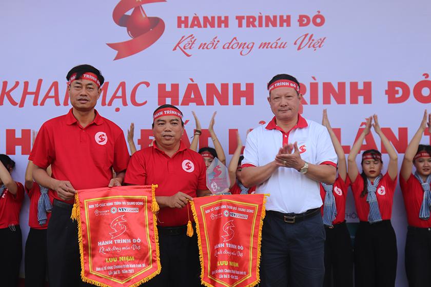 TS.BS Vũ Đức Bình, Phó Viện trưởng Viện huyết học – Truyền máu Trung ương trao biểu trưng chương trình Hành trình đỏ lần thứ XI - năm 2023 cho lãnh đạo Hội Chữ thập đỏ tỉnh và UBND huyện Cam Lộ