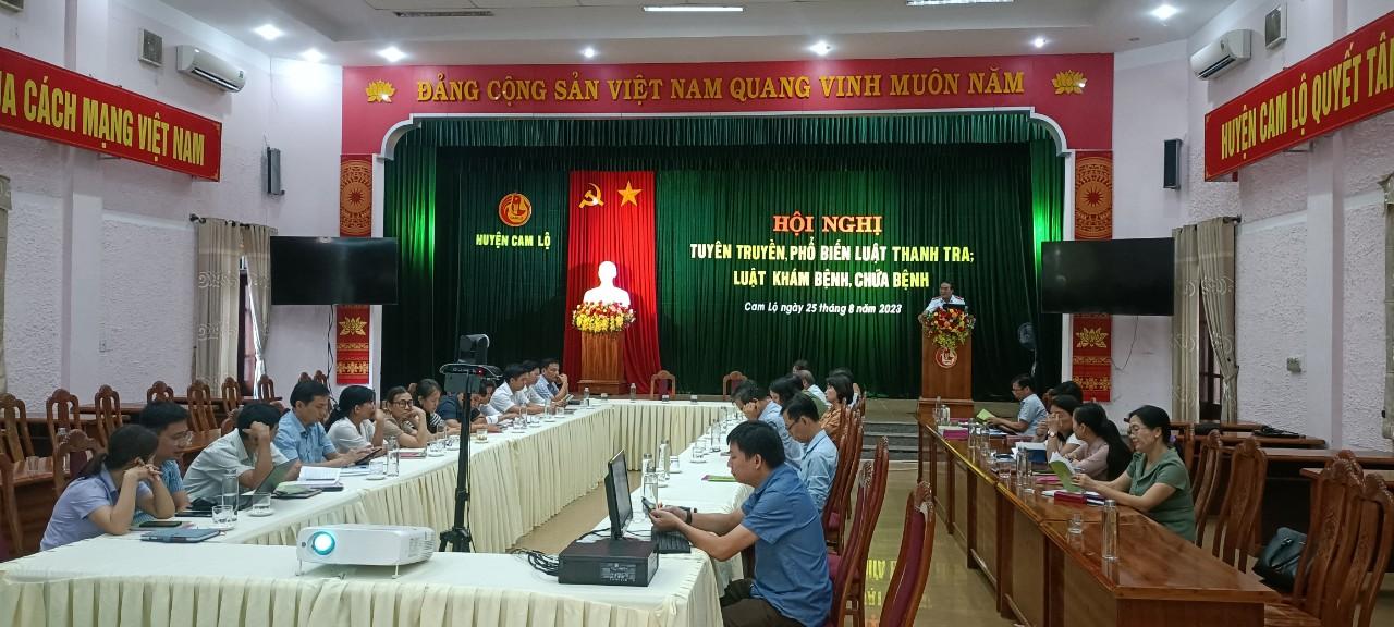 Ngày 25/8/2023, UBND huyện Cam Lộ tổ chức hội nghị tuyên truyền, phổ biến Luật Thanh tra và Luật Khám bệnh, chữa bệnh cho lãnh đạo các phòng, ban, ngành, các tổ chức chính trị - xã hội; cán bộ, công chức các xã, thị trấn trên địa bàn huyện.