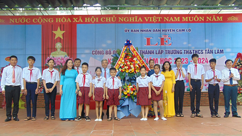 Đồng chí Trần Anh Tuấn, Chủ tịch UBND huyện tặng hoa chúc mừng giáo viên và học sinh Trường Tiểu học và THCS Tân Lâm