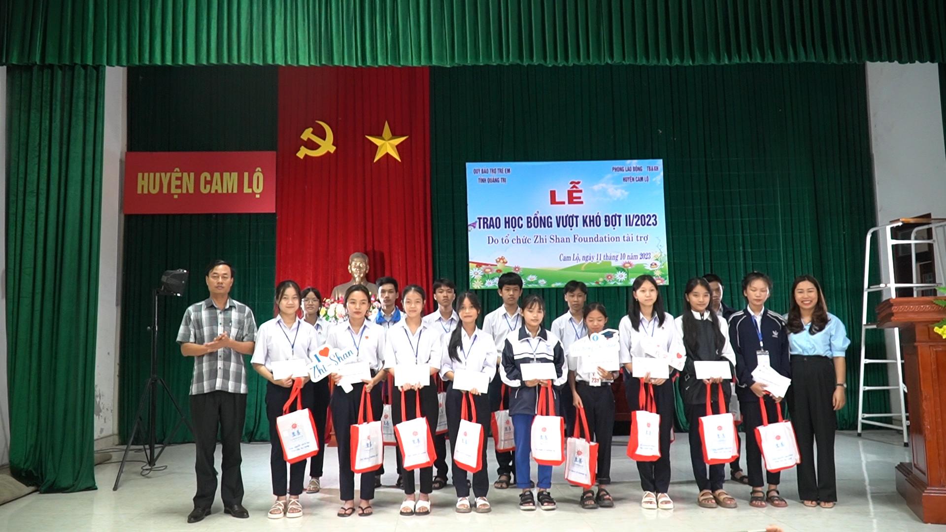Nhân dịp bước vào năm học mới 2023-2024, chiều qua 11/10/2023, Quỹ Bảo trợ trẻ em tỉnh Quảng Trị phối hợp với Phòng Lao động-Thương binh và Xã hội huyện Cam Lộ tổ chức trao học bổng vượt khó đợt 2, năm 2023 do Tổ chức Zhi Shan Foundation tài trợ.