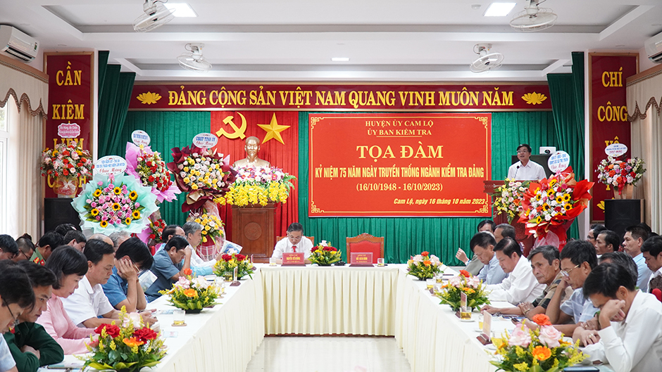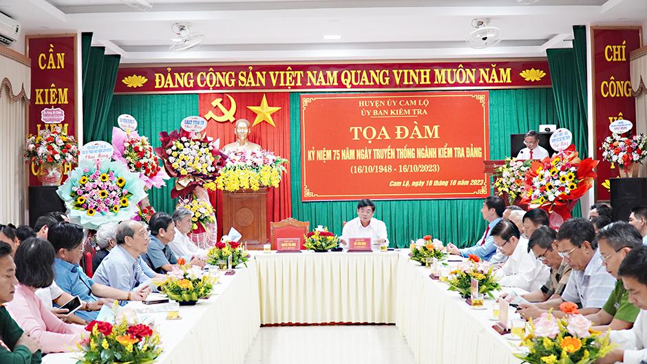 Đọc diễn văn tại buổi tọa đàm, đồng chí Nguyễn Tiến Dũng, UVBTV, Chủ nhiệm UBKT Huyện ủy đã ôn lại truyền vẻ vang của ngành Kiểm tra Đảng trong suốt 75 năm qua. Trong đó nhấn mạnh, cùng với sự ra đời, trưởng thành và phát triển ngành Kiểm tra Đảng, sau ngày thành lập Đảng bộ huyện Cam Lộ tháng 5/1930, công tác kiểm tra Đảng được giao cho các cấp uỷ, chi bộ phụ trách. Trong từng thời kỳ cách mạng theo quy định của Trung ương, hoạt động kiểm tra được các đồng chí Bí thư hoặc Cấp uỷ đảm nhận. Tháng 4/1977, ba huyện Cam Lộ, Gio Linh, Vĩnh Linh hợp nhất thành huyện Bến Hải. Năm 1981, Cam Lộ tách ra sáp nhập với thị xã Đông Hà, nên UBKT trực thuộc Thị uỷ Đông Hà. Đến 1/12/1991, huyện Cam Lộ được lập lại, dưới sự lãnh đạo của BCH Đảng bộ huyện cùng với sự giúp đỡ của các cấp, các ngành đã khắc phục những khó khăn từng bước ổn định về mặt tổ chức, đi vào hoạt động hiệu lực hiệu quả. UBKT Huyện ủy, UBKT cơ sở và đội ngũ làm công tác kiểm tra của Đảng luôn kiên định lập trường, quan điểm vượt qua khó khăn thách thức, không ngừng phấn đấu để trưởng thành, tham mưu đắc lực cho Ban Thường vụ Huyện ủy thực hiện tốt nhiệm vụ được giao, góp phần thực hiện tốt các chủ trương, nghị quyết, kết luận của Đảng, chính sách pháp luật của Nhà nước, làm trong sạch và nâng cao năng lực lãnh đạo, sức chiến đấu của Đảng.