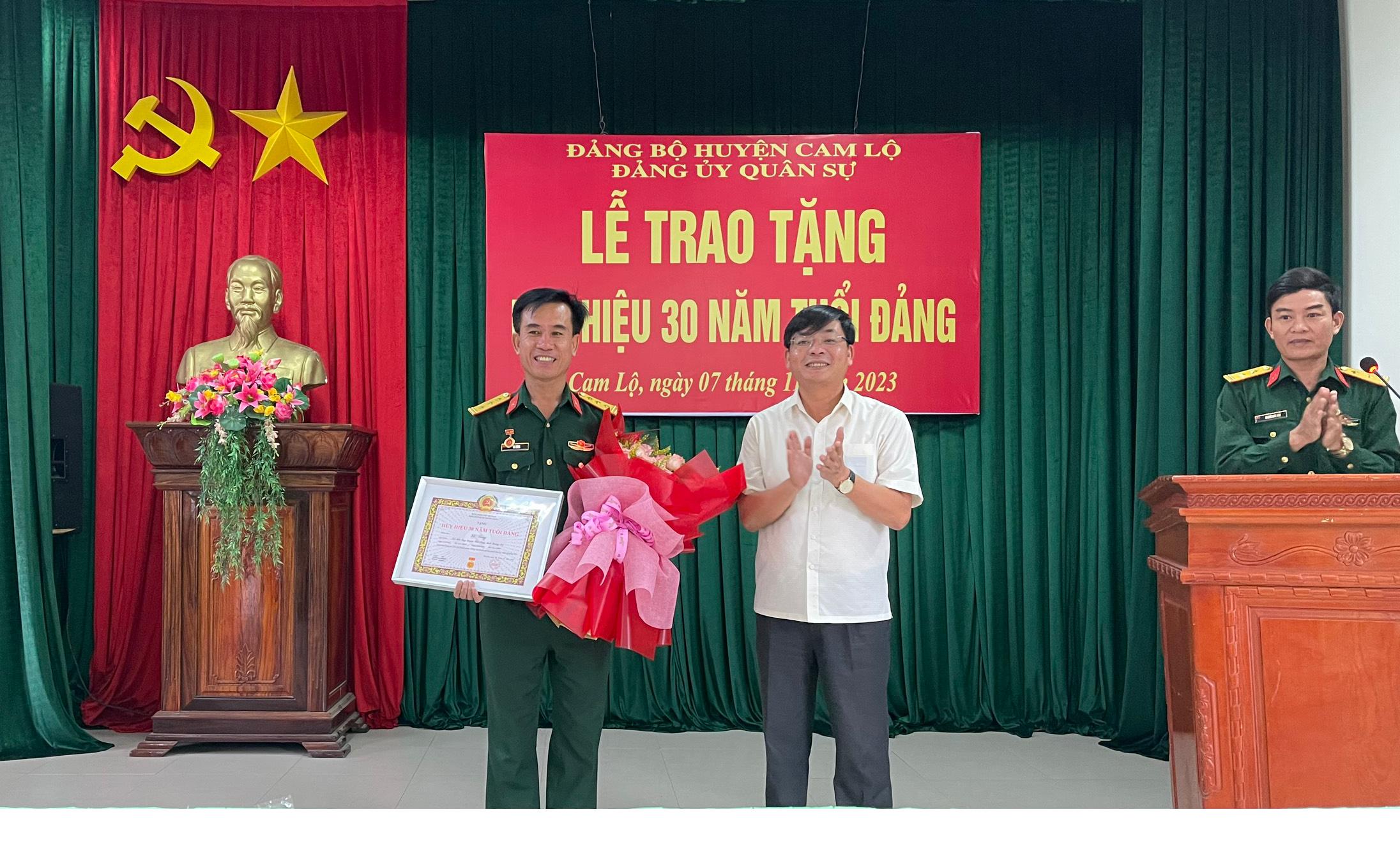 Ngày 7/11/2023, Đảng ủy Quân sự huyện Cam Lộ và Đảng bộ thị trấn Cam Lộ đã tổ chức lễ trao tặng Huy hiệu từ 30-55 năm tuổi Đảng cho 6 đảng viên có nhiều cống hiến cho sự nghiệp cách mạng. Dự lễ có đồng chí Đỗ Văn Bình, TUV, Bí thư Huyện ủy, Bí thư Đảng ủy Quân sự huyện; đồng chí Nguyễn Thị Thanh Hương, UVTV, Trưởng Ban Dân vận, Chủ tịch UBMT huyện.