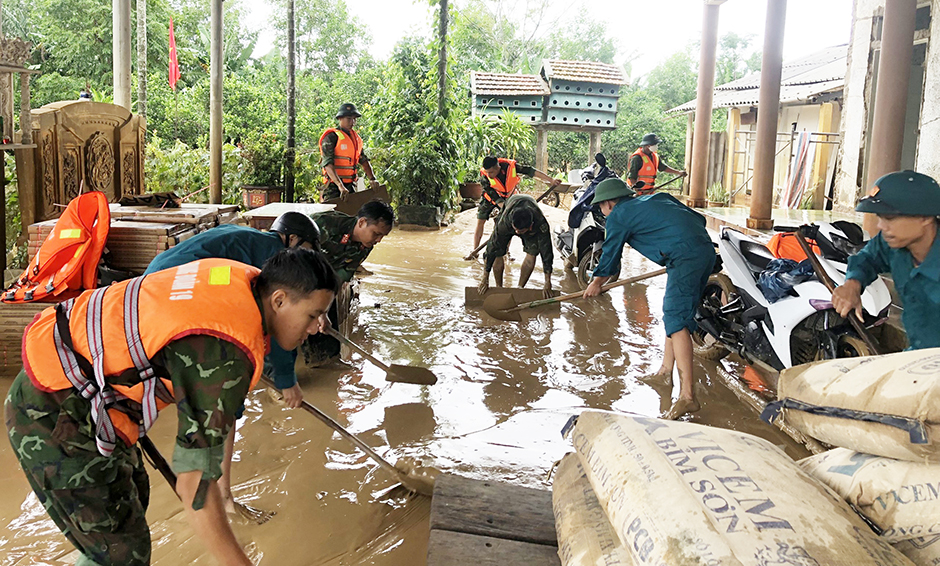 Lực lượng dân quân huyện giúp bà con thôn Định Xá, xã Cam Hiếu khắc phục mưa lũ
