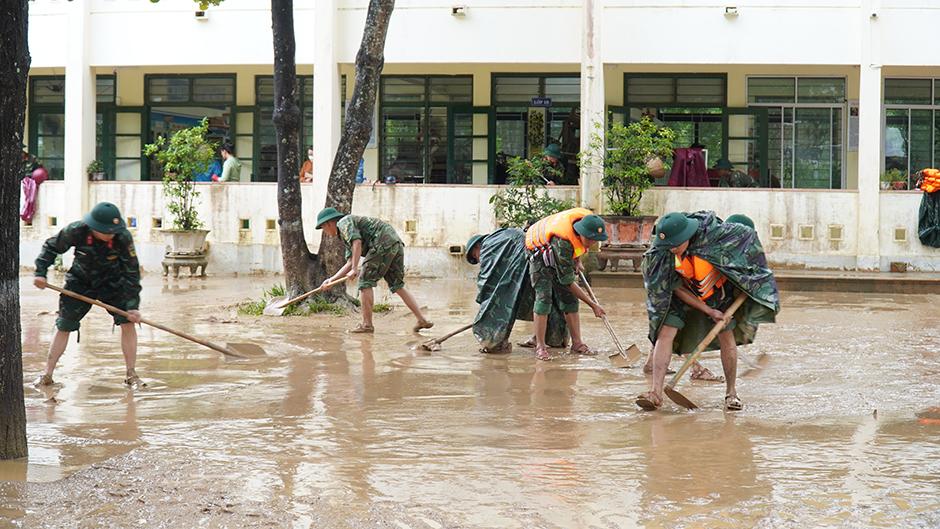 Cán bộ chiến sỹ Trung đoàn 19 giúp Trường TH&THCS Cam Tuyền dọn dẹp sau lụt