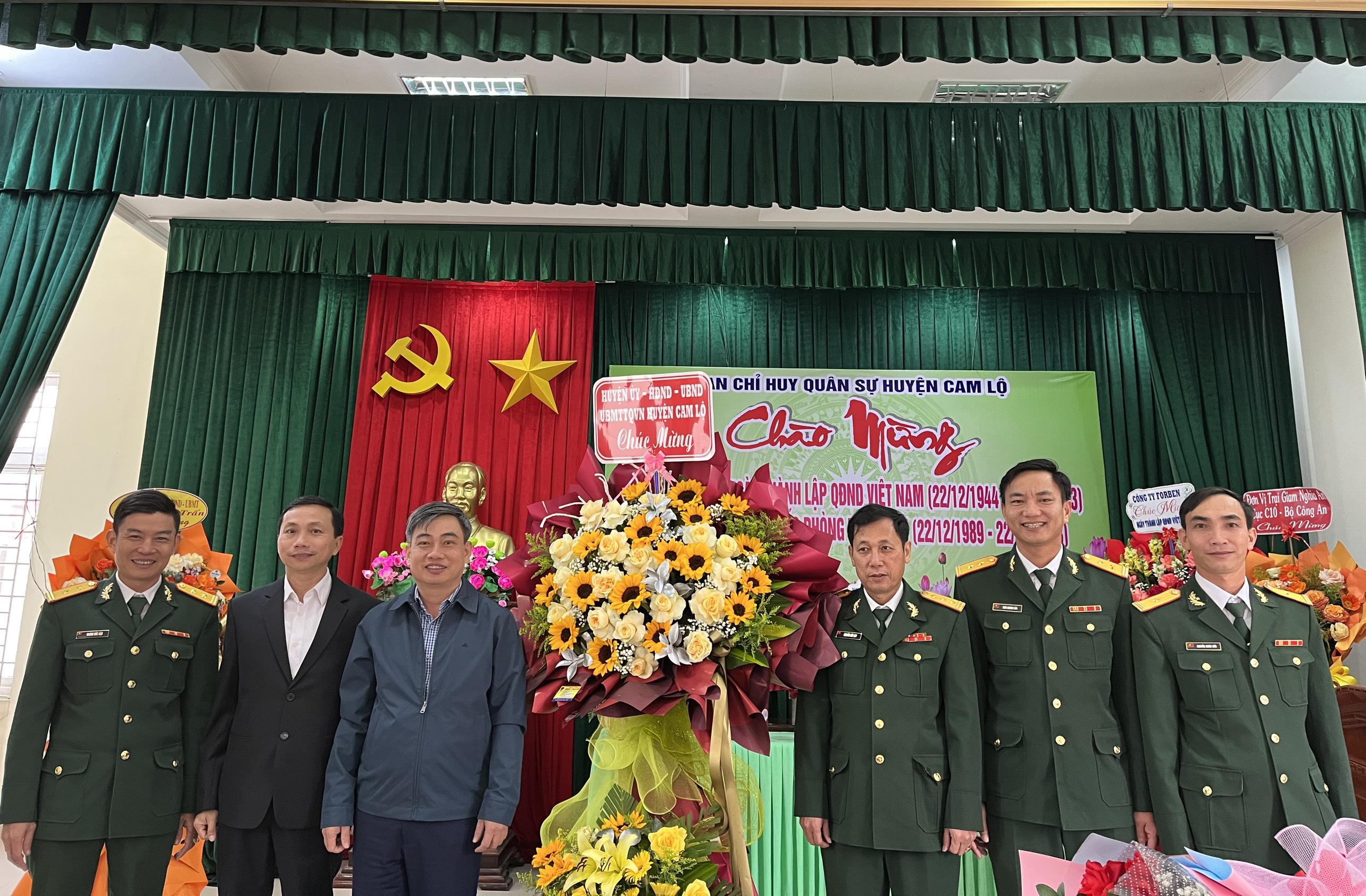 Tặng hoa, chúc mừng cán bộ, chiến sĩ Ban CHQS sự huyện, lãnh đạo huyện Cam Lộ ghi nhận, đánh giá cao vai trò và những đóng góp tích cực của đơn vị trên tất cả các lĩnh vực, từ đó góp phần quan trọng vào quá trình phát triển kinh tế - xã hội của địa phương. Đồng thời, đề nghị trong thời gian tới, Ban CHQS huyện tiếp tục phát huy hơn nữa truyền thống Bộ đội Cụ Hồ, ra sức thi đua thực hiện tốt các nhiệm vụ huấn luyện sẵn sàng chiến đấu; làm tốt hơn nữa công tác dân vận; đoàn kết thống nhất cao, xây dựng đơn vị ngày càng vững mạnh. Đặc biệt, phát huy vai trò tham mưu cho Huyện ủy, UBND huyện trong việc chỉ đạo, tổ chức củng cố vững chắc nền quốc phòng, quân sự địa phương; tiếp tục quan tâm, tạo điều kiện, phối hợp chặt chẽ với các lực lượng vũ trang đóng trên địa bàn huyện thực hiện tốt nhiệm vụ quốc phòng, an ninh, chính sách hậu phương quân đội, giữ gìn trật tự an toàn xã hội trên địa bàn.