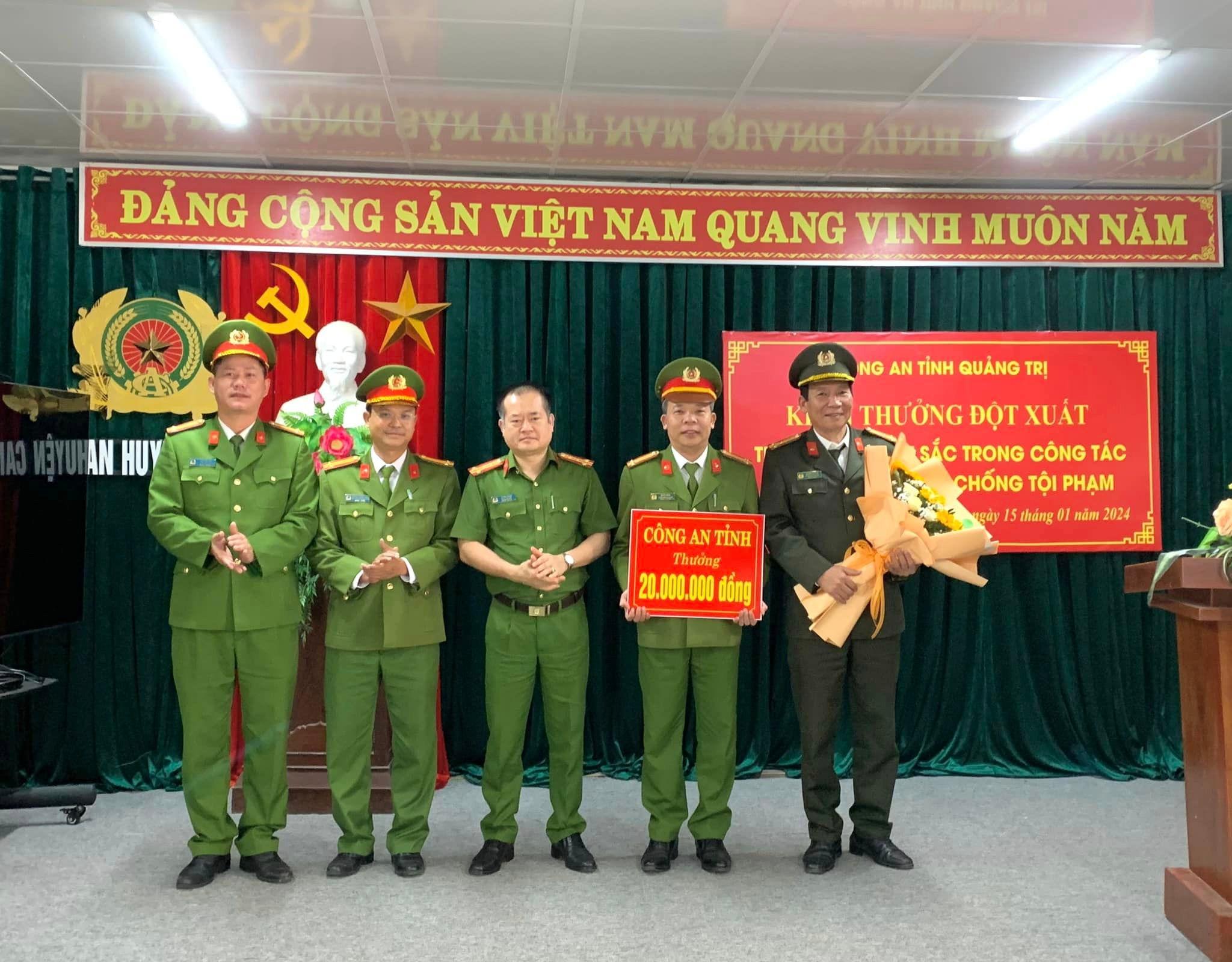 Chiều ngày 15/1/2024, Công an tỉnh Quảng Trị đã tổ chức trao thưởng 20 triệu đồng cho các cán bộ, chiến sĩ Công an huyện Cam Lộ đã có thành tích xuất sắc trong công tác đấu tranh phòng, chống tội phạm.