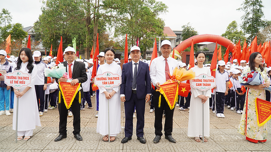 Các đồng chí lãnh đạo huyện tặng hoa và cờ lưu niệm cho các đoàn vận động viên