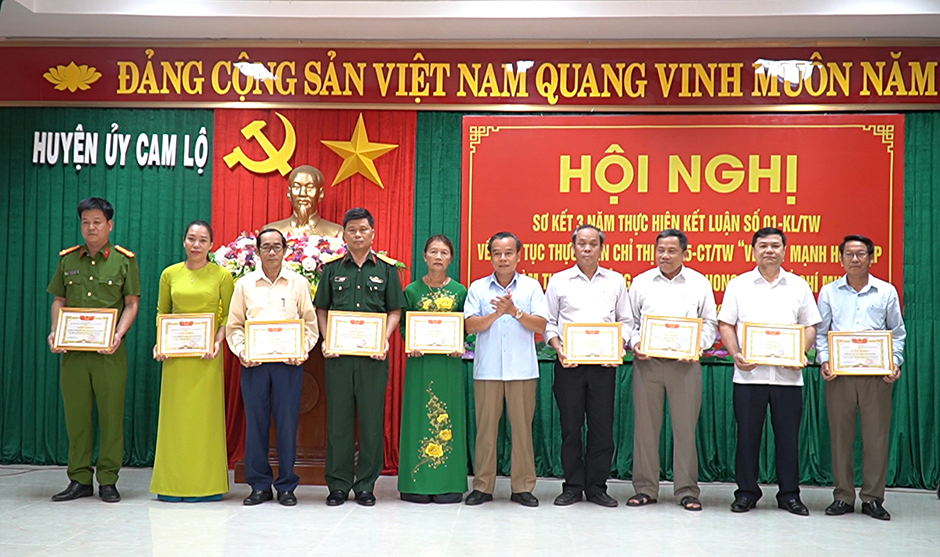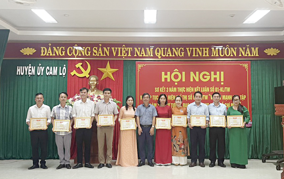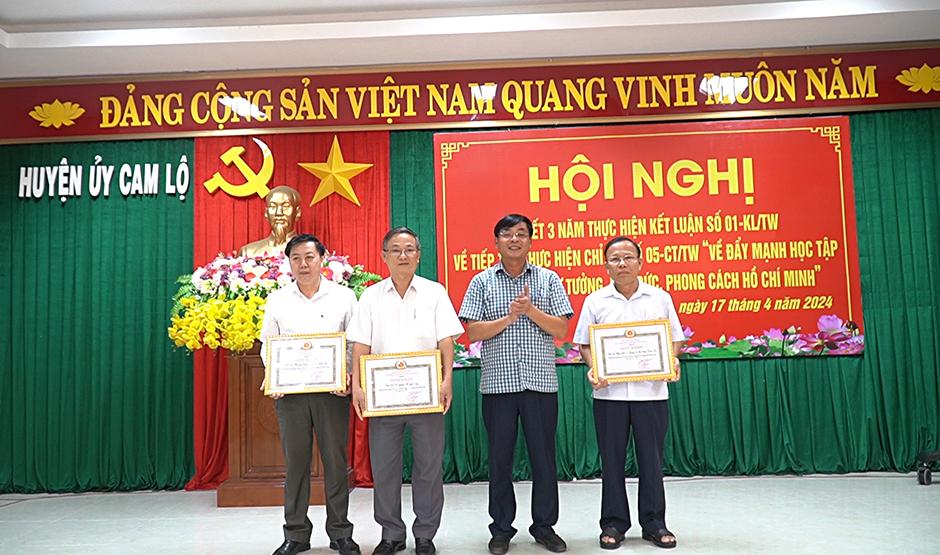 Sáng nay 17/4, Ban Thường vụ Huyện ủy Cam Lộ tổ chức hội nghị sơ kết 3 năm thực hiện Kết luận số 01-KL/TW ngày 18/5/2021 của Bộ Chính trị về tiếp tục thực hiện Chỉ thị 05 “Về đẩy mạnh học tập và làm theo tư tưởng, đạo đức, phong cách Hồ Chí Minh”; biểu dương, khen thưởng các tập thể, cá nhân tiêu biểu trong học tập và làm theo tư tưởng, đạo đức, phong cách Hồ Chí Minh giai đoạn 2021-2024. Dự hội nghị có đồng chí Nguyễn Quốc Khánh, Phó Trưởng Ban Tuyên giáo Tỉnh ủy; đồng chí Đỗ Văn Bình, TUV, Bí thư Huyện ủy; đồng chí Nguyễn Ký Ngọc, Phó Bí thư Thường trực Huyện ủy, Chủ tịch HĐND huyện, cùng các đồng chí trong Ban Thường vụ Huyện ủy; các đồng chí Ủy viên BCH Đảng bộ huyện; lãnh đạo các cơ quan, ban, ngành, UBMT và các tổ chức chính trị xã hội huyện; Bí thư các TCCSĐ; lãnh đạo các xã, thị trấn; các tập thể, cá nhân điển hình được khen thưởng.