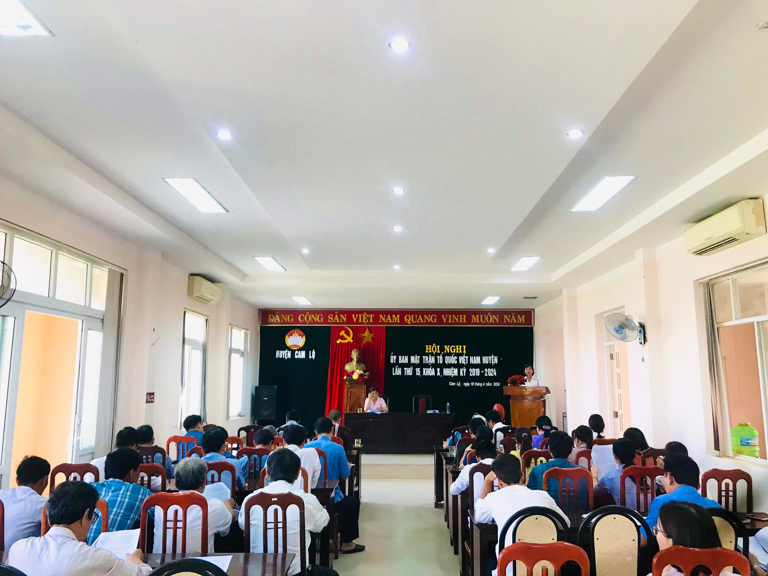 Ngày 19/4/2024, Ủy ban MTTQVN huyện Cam Lộ tổ chức hội nghị lần thứ 15, nhiệm kỳ 2019-2024 nhằm tổng kết công tác tổ chức Đại hội Mặt trận Tổ quốc Việt Nam cấp cơ sở, nhiệm kỳ 2024-2029; lấy ý kiến các vị đại biểu tham dự hội nghị tham gia dự thảo báo cáo chính đại hội Mặt trận huyện.