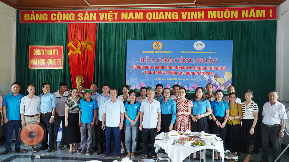 Nhân ngày Quốc tế lao động 1/5, hưởng ứng Tháng công nhân năm 2024, hôm nay 25/4, LĐLĐ huyện Cam Lộ phối hợp với Công ty TNHH MTV Nhất Long Quảng Trị tổ chức “Bữa cơm Công đoàn” cho người lao động các doanh nghiệp trên địa bàn. Tham dự có đồng chí Nguyễn Thị Thu Hà, Phó Chỉ tịch LĐLĐ tỉnh; đồng chí Nguyễn Ký Ngọc, Phó Bí thư Thường trực Huyện ủy, Chủ tịch HĐND huyện; đồng chí Trần Anh Tuấn, Chủ tịch UBND huyện.