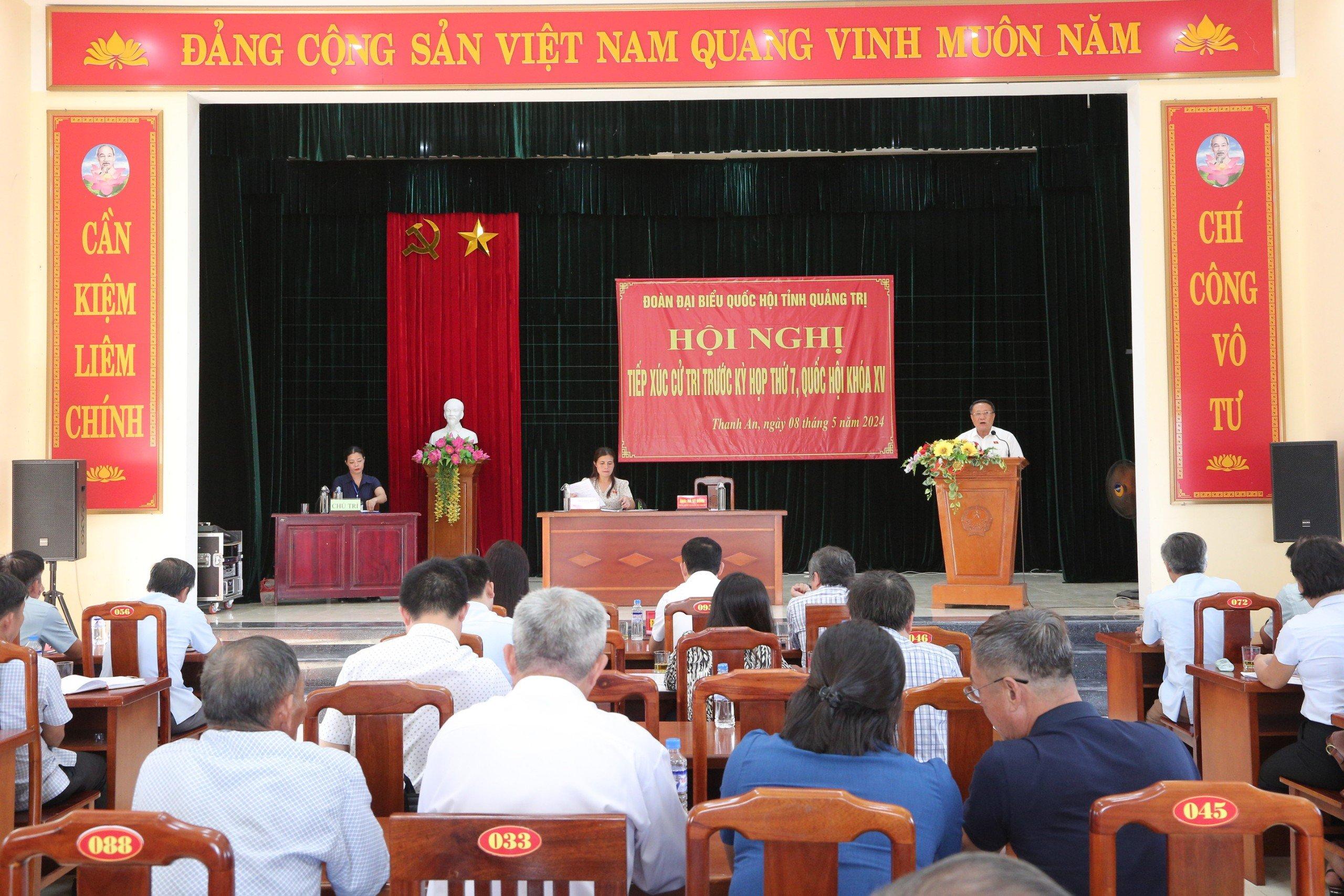 Để chuẩn bị cho Kỳ họp thứ 7, Quốc hội khóa XV, chiều ngày 8/5/2024, Đoàn Đại biểu Quốc hội (ĐBQH) tỉnh Quảng Trị gồm ông Hà Sỹ Đồng, UVBTVTU, Phó Chủ tịch Thường trực UBND tỉnh; bà Hồ Thị Minh, Phó Trưởng Ban Dân tộc tỉnh đã có buổi tiếp xúc cử tri tại xã Thanh An, huyện Cam Lộ.