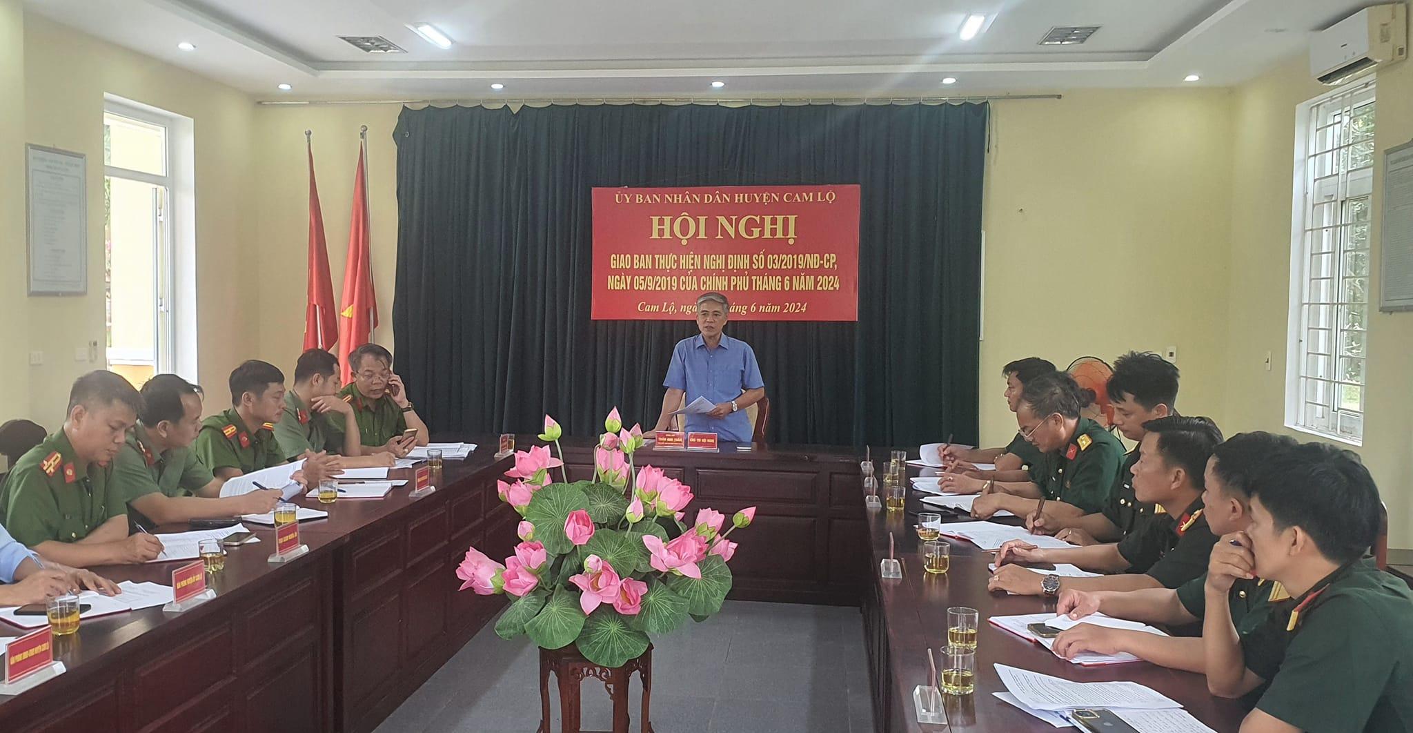 Chiều ngày 26/6/2024, UBND huyện Cam Lộ đã tổ chức hội nghị giao ban tháng 6 thực hiện Nghị định số 03/2019/NĐ-CP ngày 05/9/2019 của Chính Phủ về công tác phối hợp giữa công an, quân sự và các lực lượng đóng quân trên địa bàn huyện. Đồng chí Trần Anh Tuấn, Chủ tịch UBND huyện chủ trì hội nghị.