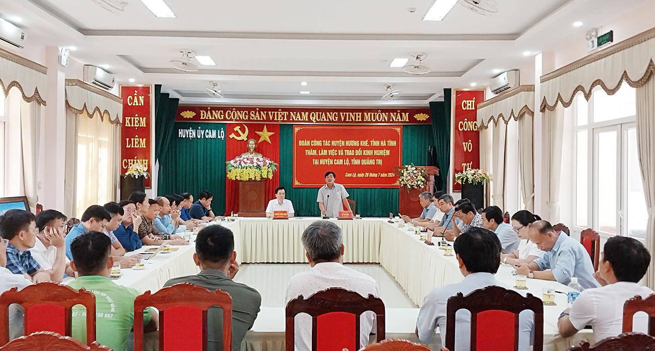 Trong 2 ngày 26-27/7/2024, Đoàn công tác huyện Hương Khê, tỉnh Hà Tĩnh do đồng chí Nguyễn Thanh Điện, TUV, Bí thư Huyện ủy làm trưởng đoàn đã có chuyến thăm, làm việc, trao đổi kinh nghiệm tại huyện Cam Lộ. Cùng đi với đoàn có đồng chí Ngô Xuân Ninh, Phó Bí thư Huyện ủy, Chủ tịch UBND huyện; đồng chí Nguyễn Văn Hiệp, UVBTV Huyện uỷ, Phó Chủ tịch HĐND huyện và lãnh đạo một số cơ quan, đơn vị huyện Hương Khê. Tiếp và làm việc với đoàn, về phía huyện Cam Lộ có đồng chí Đỗ Văn Bình, TUV, Bí thư Huyện ủy; đồng chí Trần Anh Tuấn, Chủ tịch UBND huyện; đồng chí Nguyễn Thị Thanh Hương, UVBTV Huyện ủy, Trưởng Ban Dân vận, Chủ tịch UBMT huyện; đồng chí Trần Hoài Linh, UVTV, Phó Chủ tịch UBND huyện cùng lãnh đạo các cơ quan, đơn vị, UBND các xã, thị trấn.