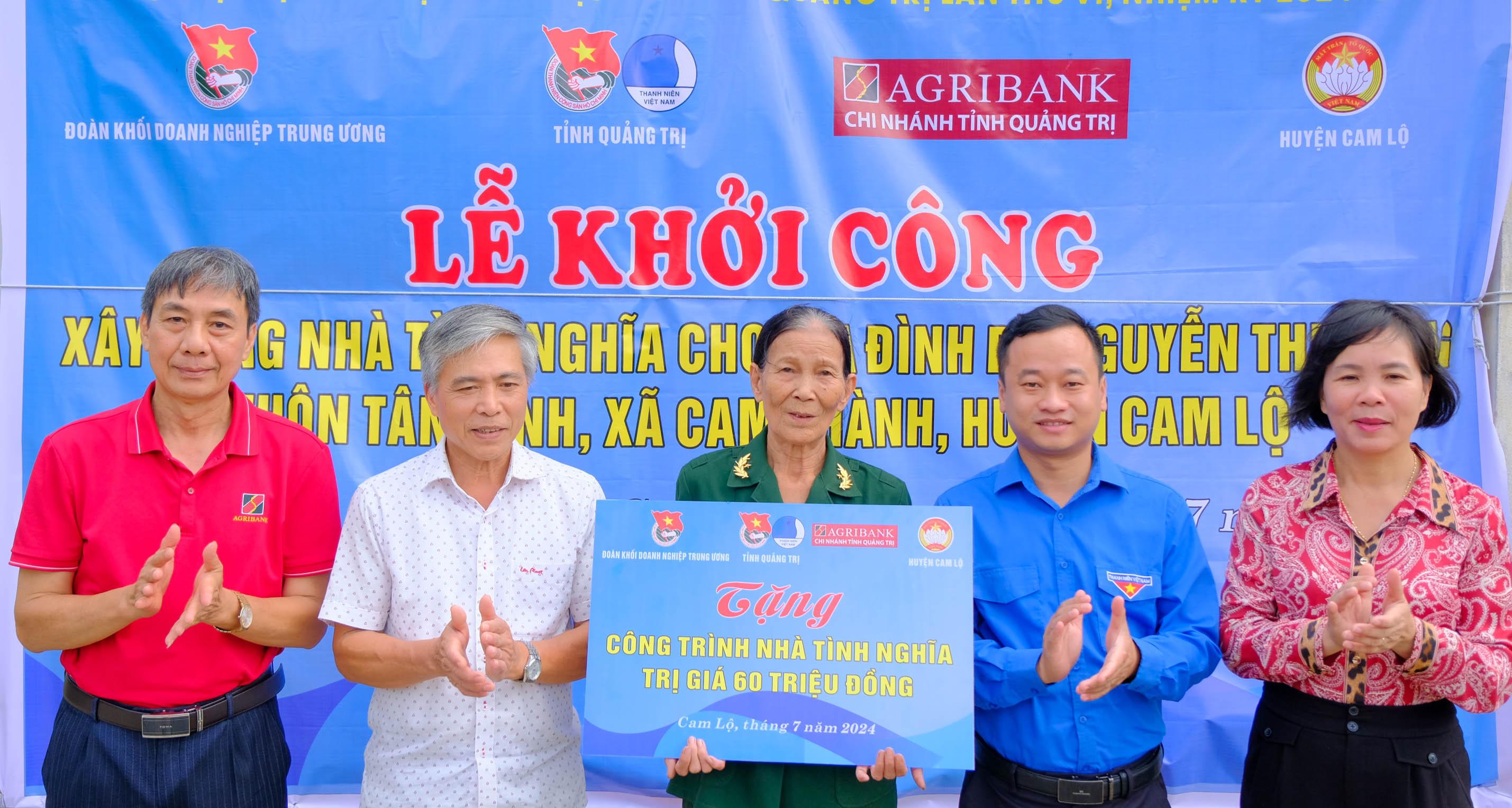 Nhân kỷ niệm 77 năm Ngày Thương binh - Liệt sĩ, Đoàn Khối Doanh nghiệp Trung ương, Tỉnh đoàn Quảng Trị, Hội Liên hiệp thanh niên Việt Nam tỉnh Quảng Trị, Agribank Quảng Trị, Ủy ban MTTQ Việt Nam huyện Cam Lộ phối hợp tổ chức lễ khởi công xây dựng nhà tình nghĩa cho gia đình cựu thanh niên xung phong Nguyễn Thị Hồng, ở thôn Tân Định, xã Cam Thành, huyện Cam Lộ.
