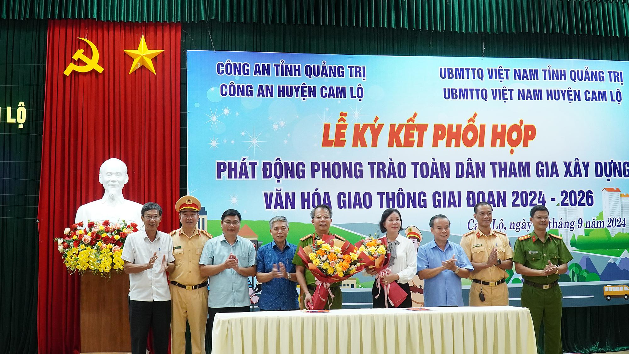 Chiều nay 16/9, Công an huyện Cam Lộ và Ủy ban MTTQ Việt Nam huyện tổ chức ký kết phối hợp phát động phong trào “Toàn dân tham gia xây dựng văn hoá giao thông” giai đoạn 2024-2026. Dự lễ ký kết có đồng chí Dương Tân Long, Phó Chủ tịch UBMTTQ Việt Nam tỉnh; đồng chí Nguyễn Ký Ngọc, Phó Bí thư Thường trực Huyện ủy, Chủ tịch HĐND huyện; đồng chí Nguyễn Thị Thanh Hương, UVTV, Trưởng Ban Dân vận, Chủ tịch Ủy ban MTTQ Việt Nam huyện; đồng chí Đào Mạnh Hùng, UVTV, Phó Chủ tịch HĐND huyện; Trung tá Hồ Sỹ Đông, UVTV, Trưởng công an huyện.