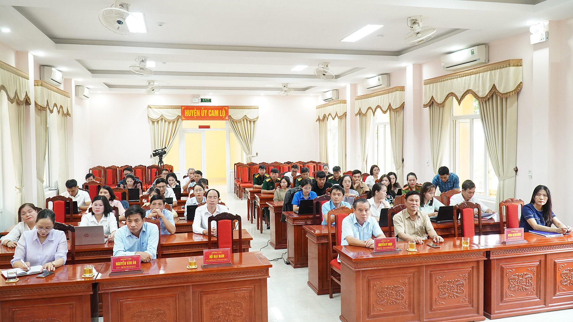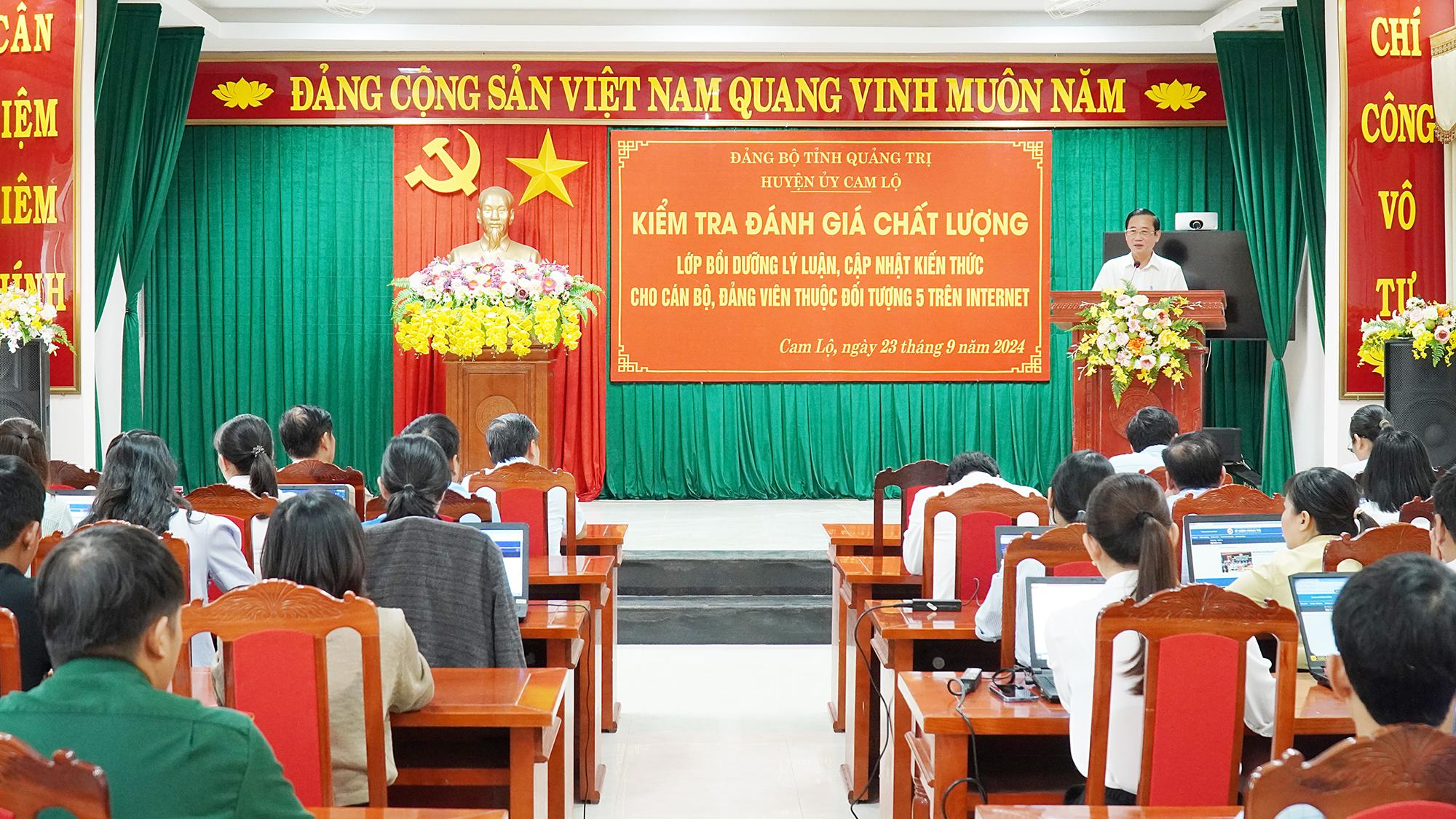 Sáng nay 23/9, Huyện ủy Cam Lộ tổ chức kiểm đánh giá chất lượng lớp bồi dưỡng lý luận, cập nhật kiến thức cho cán bộ, đảng viên thuộc đối tượng 5 trên internet. Đến dự có đồng chí Hồ Đại Nam, UVBTVTU, Trưởng Ban Tuyên giáo Tỉnh ủy; đồng chí Nguyễn Ký Ngọc, Phó Bí thư Thường Trực Huyện ủy, Chủ tịch HĐND huyện; đồng chí Nguyễn Văn Ân, UVBTV, Trưởng Ban Tuyên giáo Huyện ủy.