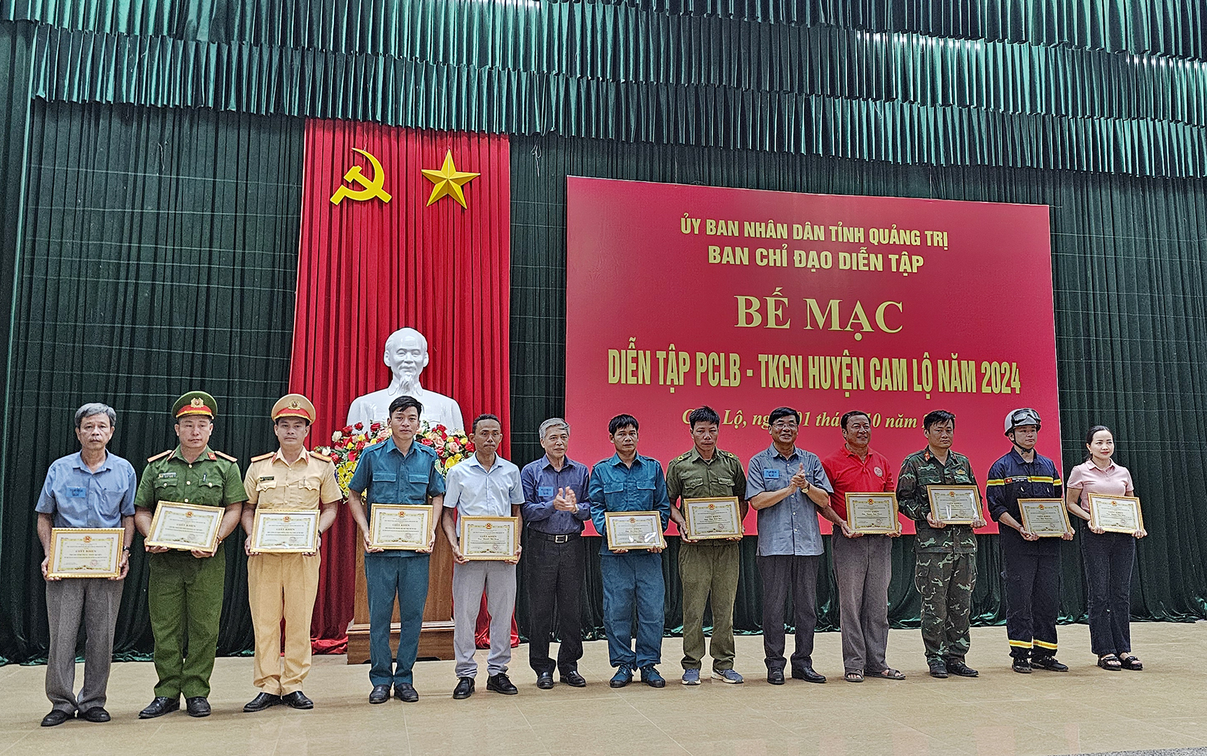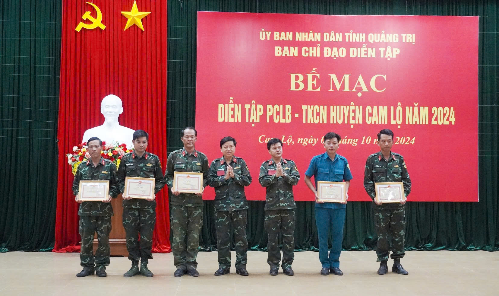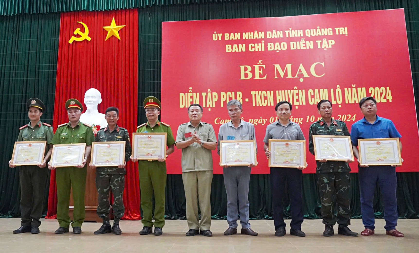 Dịp này, Chủ tịch UBND tỉnh đã tặng bằng khen cho 4 tập thể và 4 cá nhân; Bộ CHQS tỉnh tặng giấy khen cho 2 tập thể, 3 cá nhân; UBND huyện Cam Lộ tặng giấy khen cho 4 tập thể và 9 cá nhân có nhiều thành tích trong diễn tập PCLB-TKCN huyện Cam Lộ năm 2024.