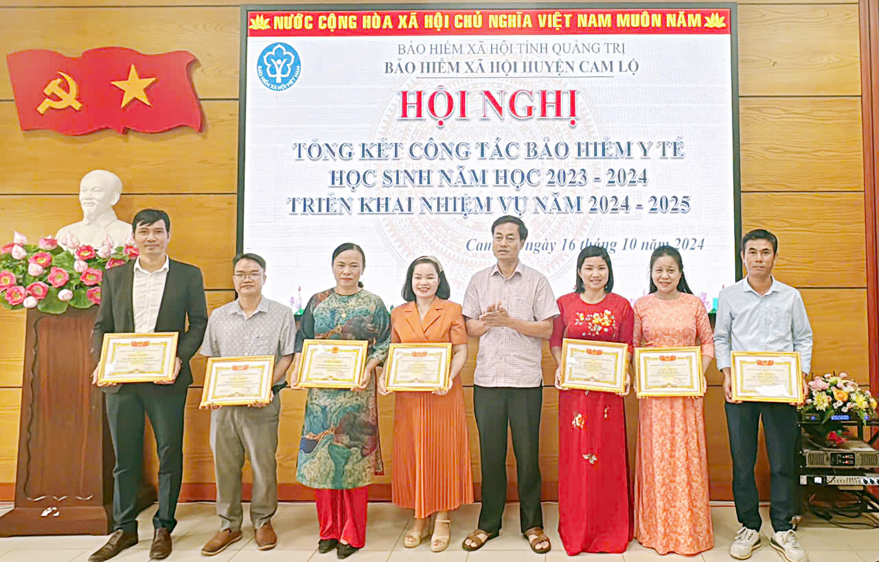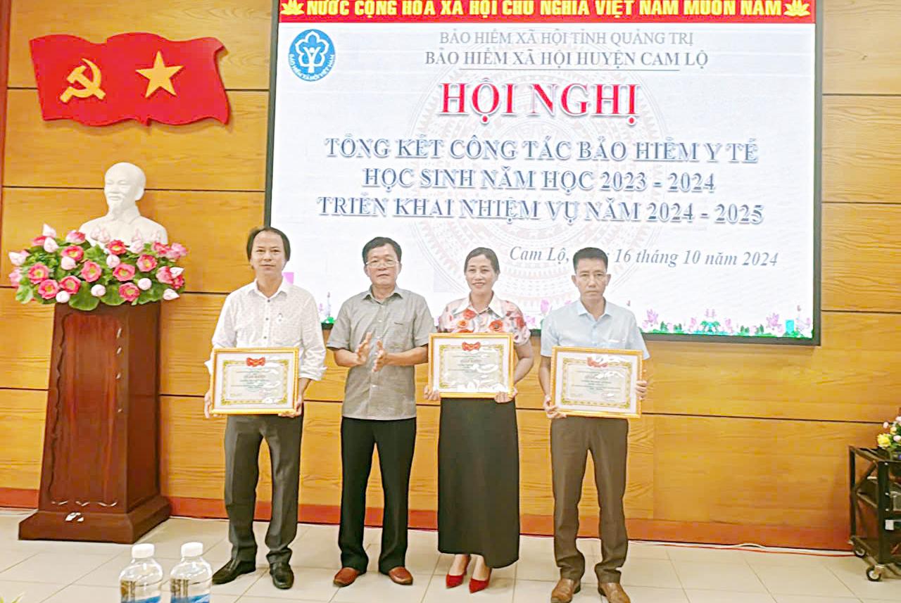 Dịp này, Giám đốc BHXH tỉnh Quảng Trị cho 3 tập thể, 1 cá nhân và giấy khen của Chủ tịch UBND huyện Cam Lộ cho 5 tập thể, 4 cá nhân có thành tích xuất sắc trong phối hợp tuyên truyền, thực hiện chính sách BHYT năm học 2023-2024.