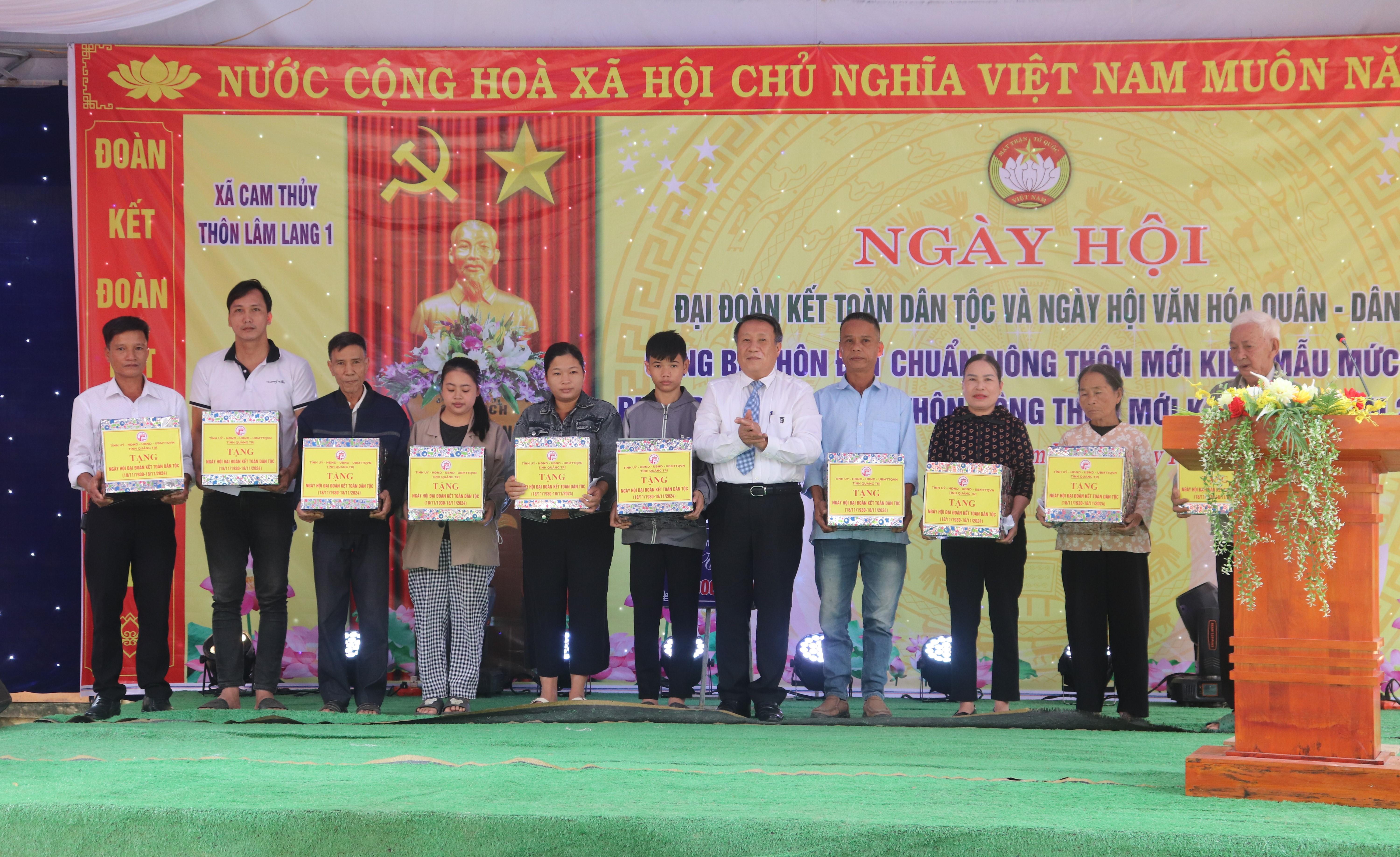 Dịp này, lãnh đạo tỉnh, huyện Cam Lộ và lãnh đạo xã Cam Thủy tặng nhiều suất quà cho nhiều gia đình chính sách, hộ nghèo, hộ gặp hoàn cảnh khó khăn ở khu dân cư Lâm Lang 1. Chủ tịch UBND huyện Cam Lộ trao quyết định công nhận thôn Lâm Lang 1 đạt chuẩn nông thôn mới kiểu mẫu mức 2 năm 2024, tặng công trình phúc lợi trị giá 70 triệu đồng cho địa phương. UBND xã Cam Thủy biểu dương, khen thưởng cho các tập thể và cá nhân tiêu biểu có thành tích xuất sắc trong thực hiện các cuộc vận động, phong trào thi đua yêu nước tại khu dân cư Lâm Lang 1.
