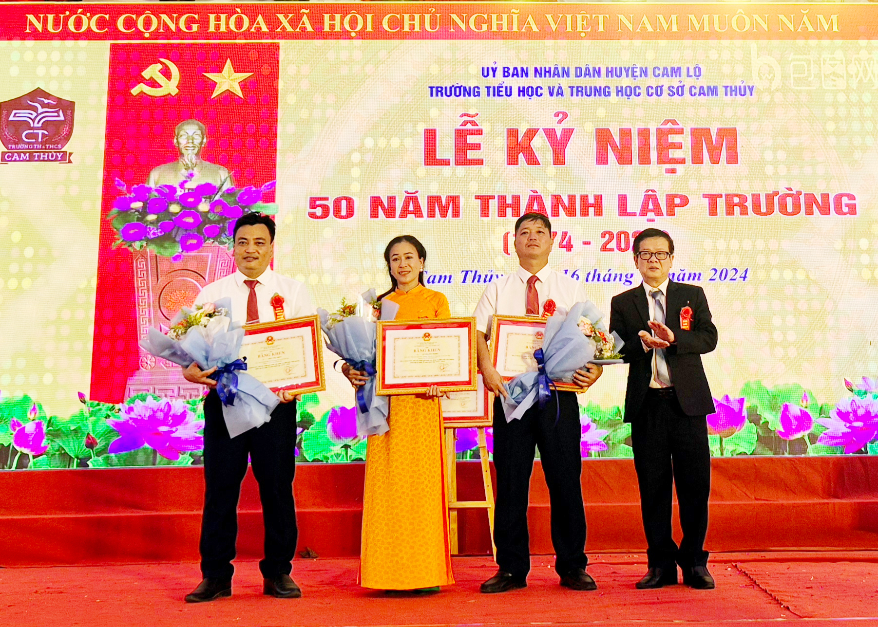 Nhân dịp này, Bộ trưởng Bộ Giáo dục và Đào tạo tặng Bằng khen cho Trường TH&THCS Cam Thuỷ cùng 3 cá nhân thuộc trường đã có thành tích xuất sắc trong quá trình xây dựng và phát triển nhà trường nhân kỷ niệm 50 năm ngày thành lập 1974-2024.