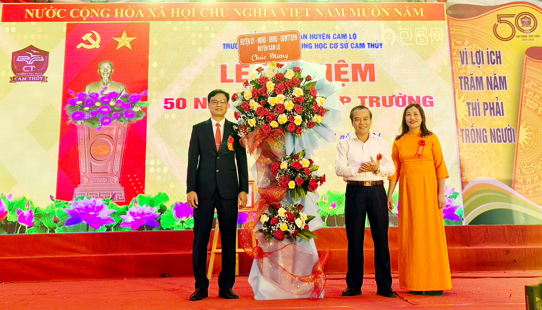 Sáng nay 16/11, Trường Tiểu học và Trung học cơ sở (TH&THCS) Cam Thủy, huyện Cam Lộ long trọng tổ chức Lễ kỷ niệm 50 năm thành lập (1974-2024). Dự lễ kỷ niệm có đồng chí Phan Hữu Huyện, Phó Giám đốc Sở Giáo dục và Đào tạo tỉnh Quảng Trị; đồng chí Nguyễn Ký Ngọc, Phó Bí thư Thường trực Huyện ủy, Chủ tịch HĐND huyện; đồng chí Trần Anh Tuấn, Chủ tịch UBND huyện; đồng chí Nguyễn Thị Thanh Hương, UVBTV, Trưởng Ban Dân vận, Chủ tịch UBMT huyện cùng các đồng chí trong Ban Thường vụ Huyện ủy, Thường trực HĐND, UBND huyện.
