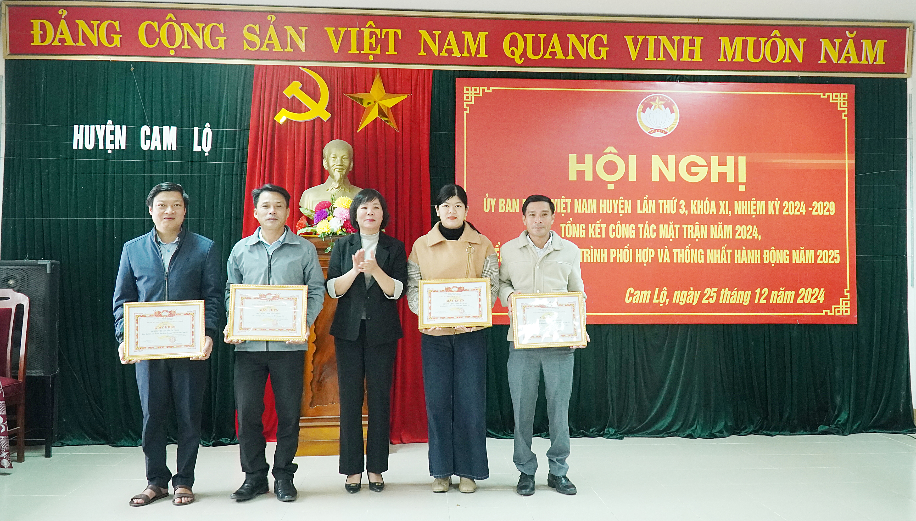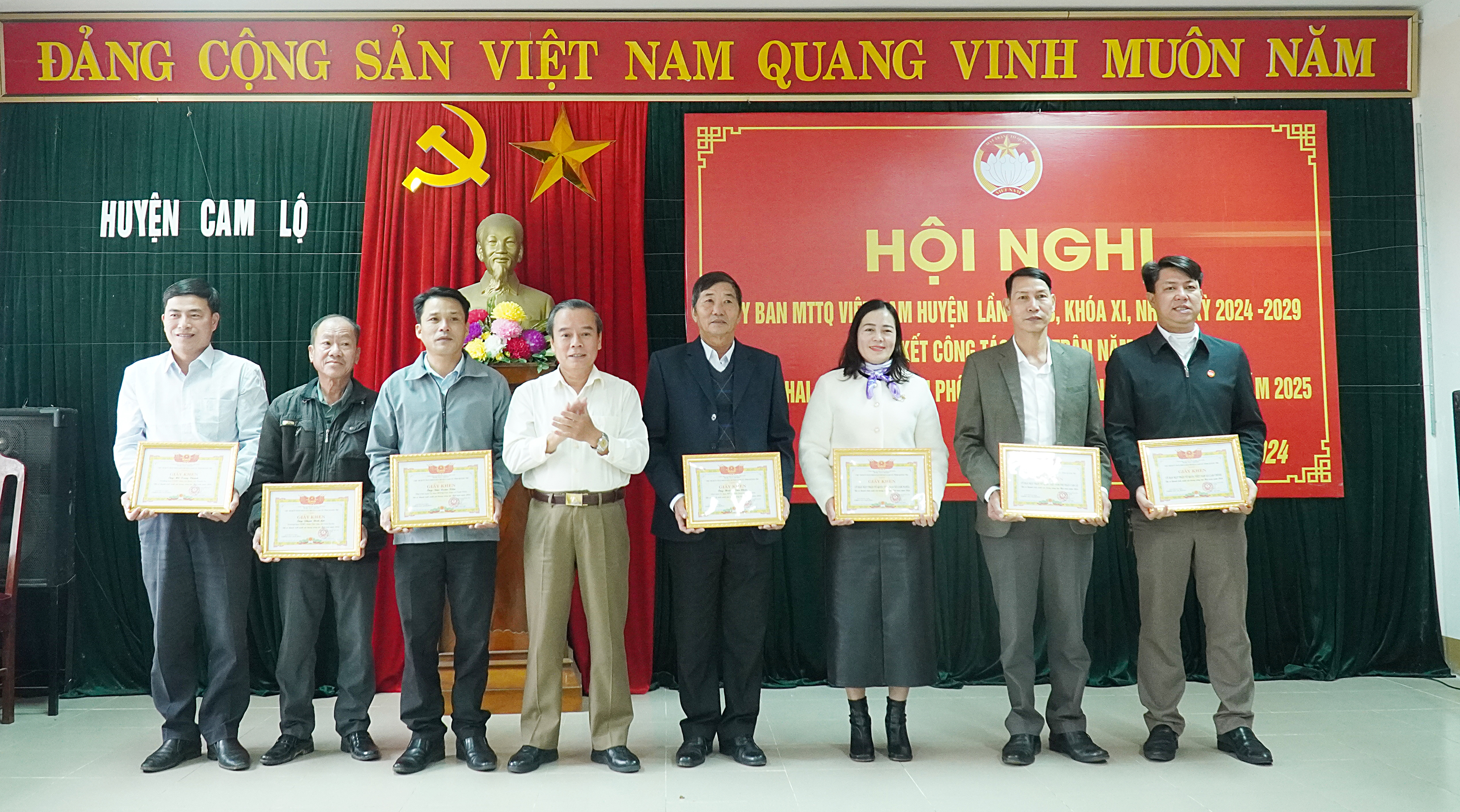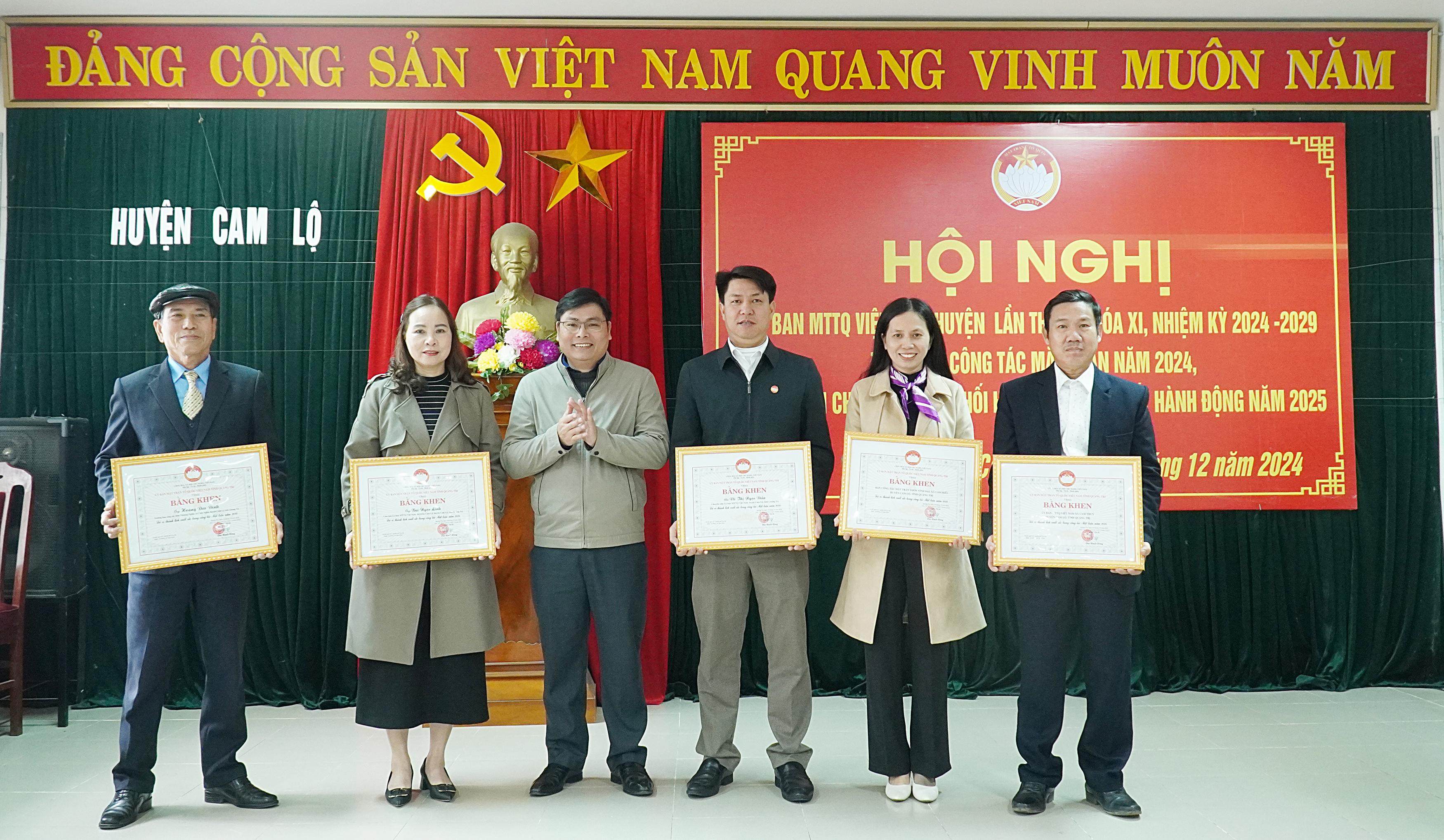 Dịp này, Ủy ban MTTQVN tỉnh tặng bằng khen cho 2 tập thể và 3 cá nhân; UBND huyện tặng giấy khen cho 3 tập thể 5 cá nhân; Ủy ban MTTVN huyện tặng giấy khen cho 4 tập thể có nhiều thành tích xuất sắc trong công tác mặt trận năm 2024.