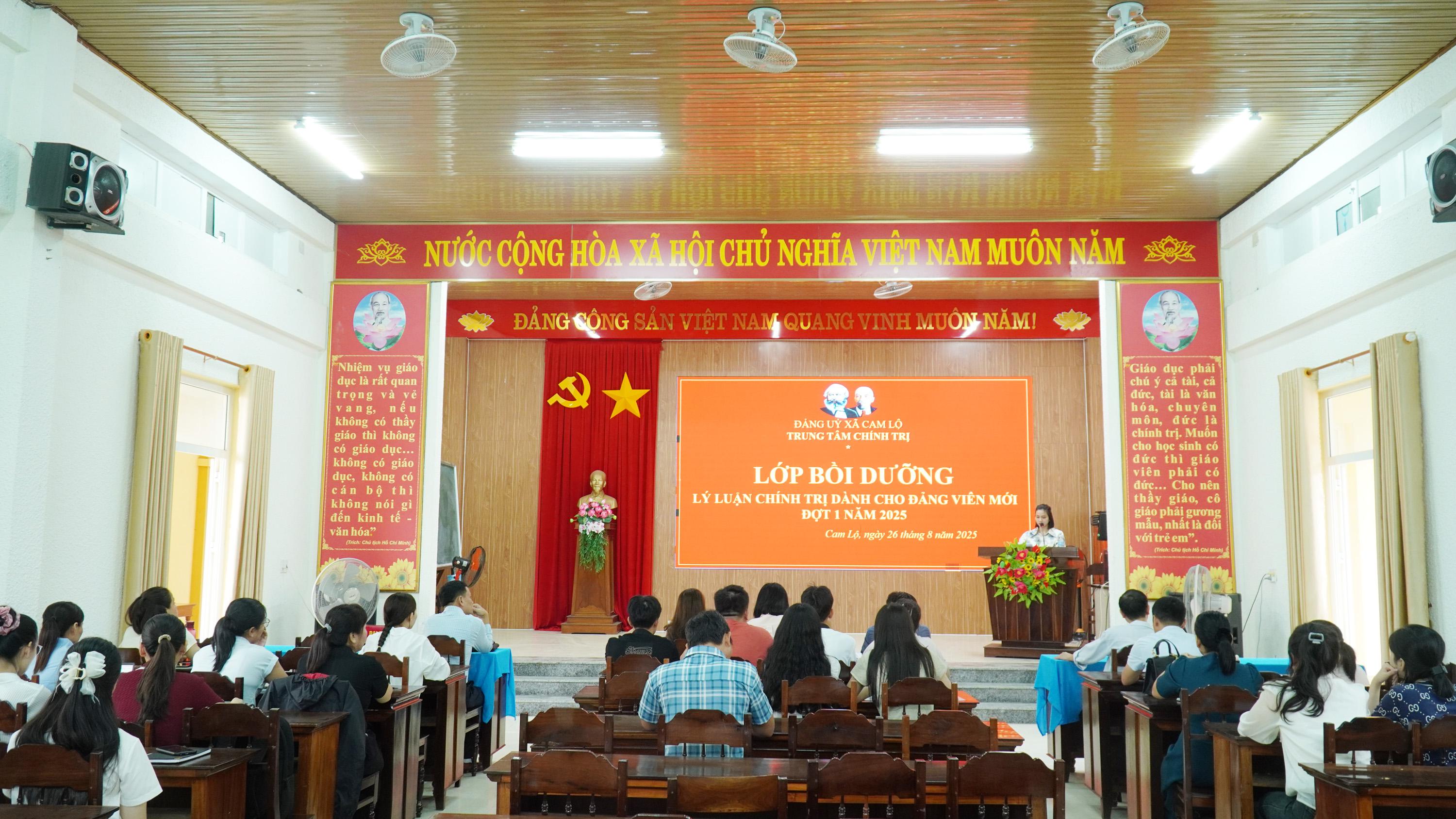 Ngày 26/8, Trung tâm Chính trị xã Cam Lộ tổ chức khai giảng lớp bồi dưỡng lý luận chính trị dành cho Đảng viên mới đợt 1 năm 2025 cho 50 học viên đến từ 2 xã Cam Lộ và Hiếu Giang. Dự lễ khai giảng có đồng chí Nguyễn Thị Hoàng Oanh, Phó Bí thư Thường trực Đảng ủy xã Cam Lộ; đồng chí Lê Thị Phương, Phó Trưởng Ban Xây dựng Đảng xã Hiếu Giang.