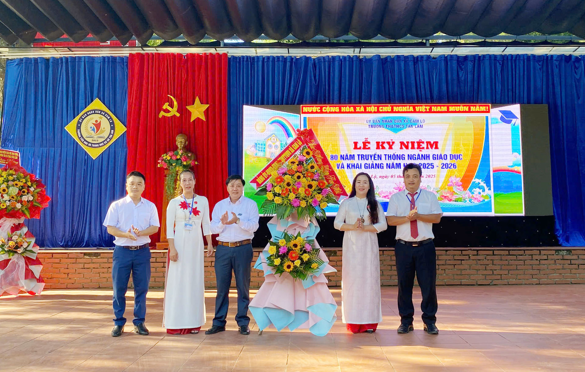 Phó Chủ tịch UBND xã Nguyễn Tiến Long tặng hoa chúc mừng Trường Tiểu học và Trung học cơ sở Tân Lâm