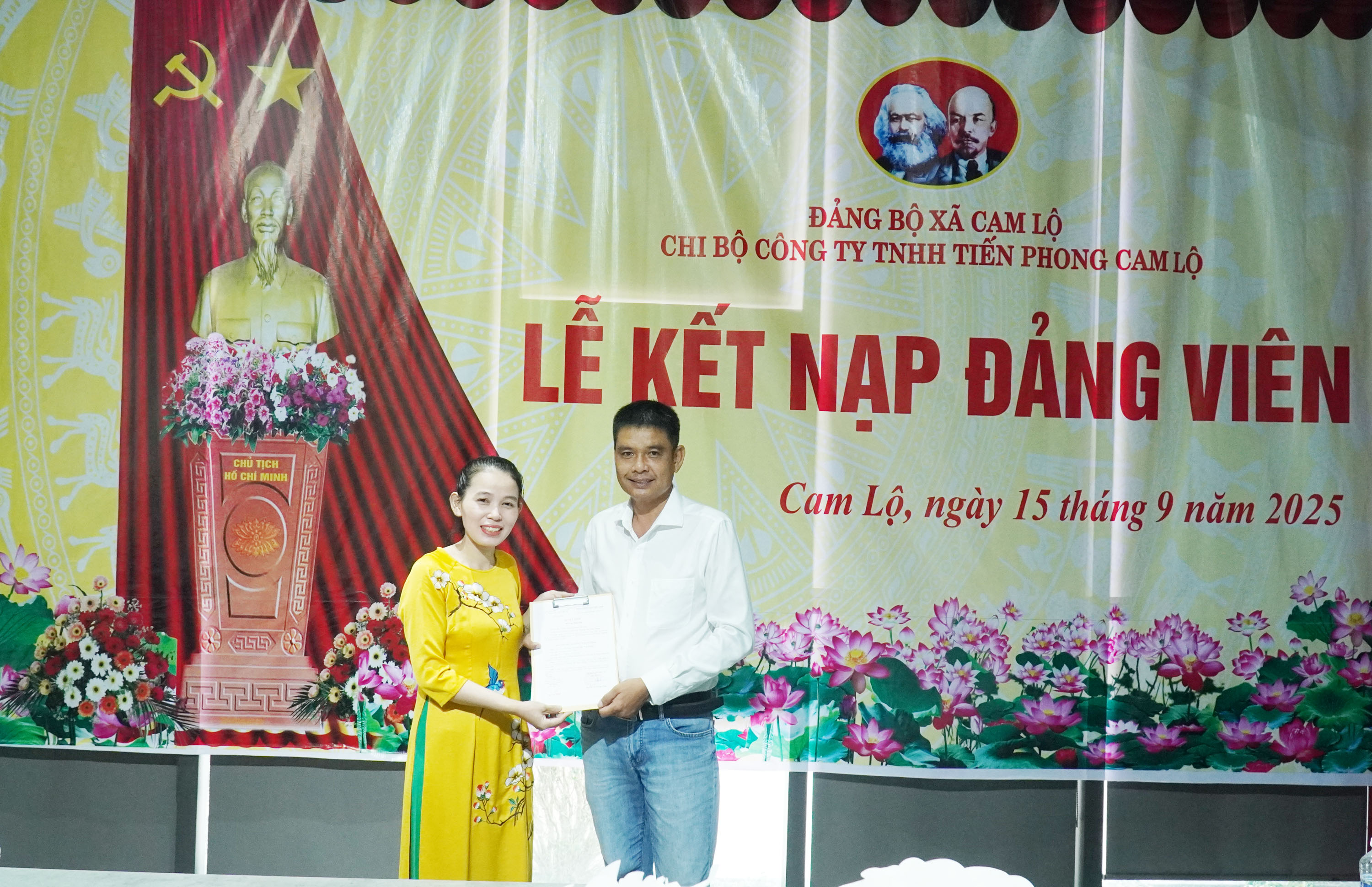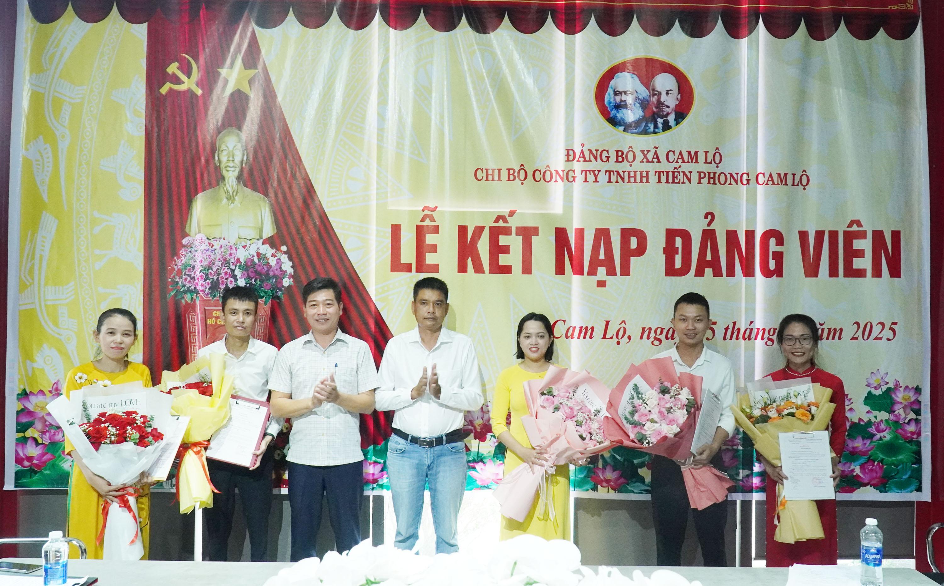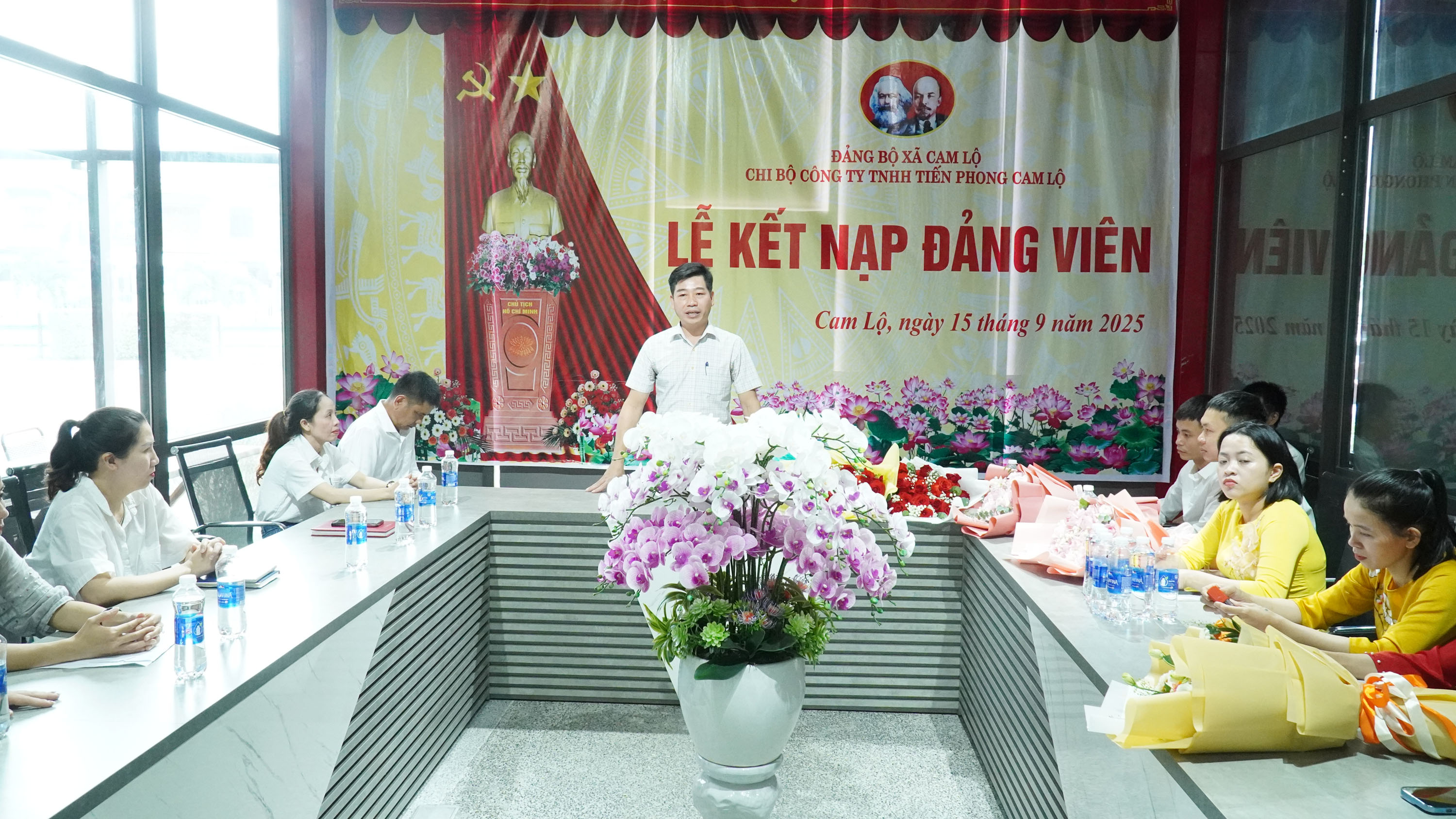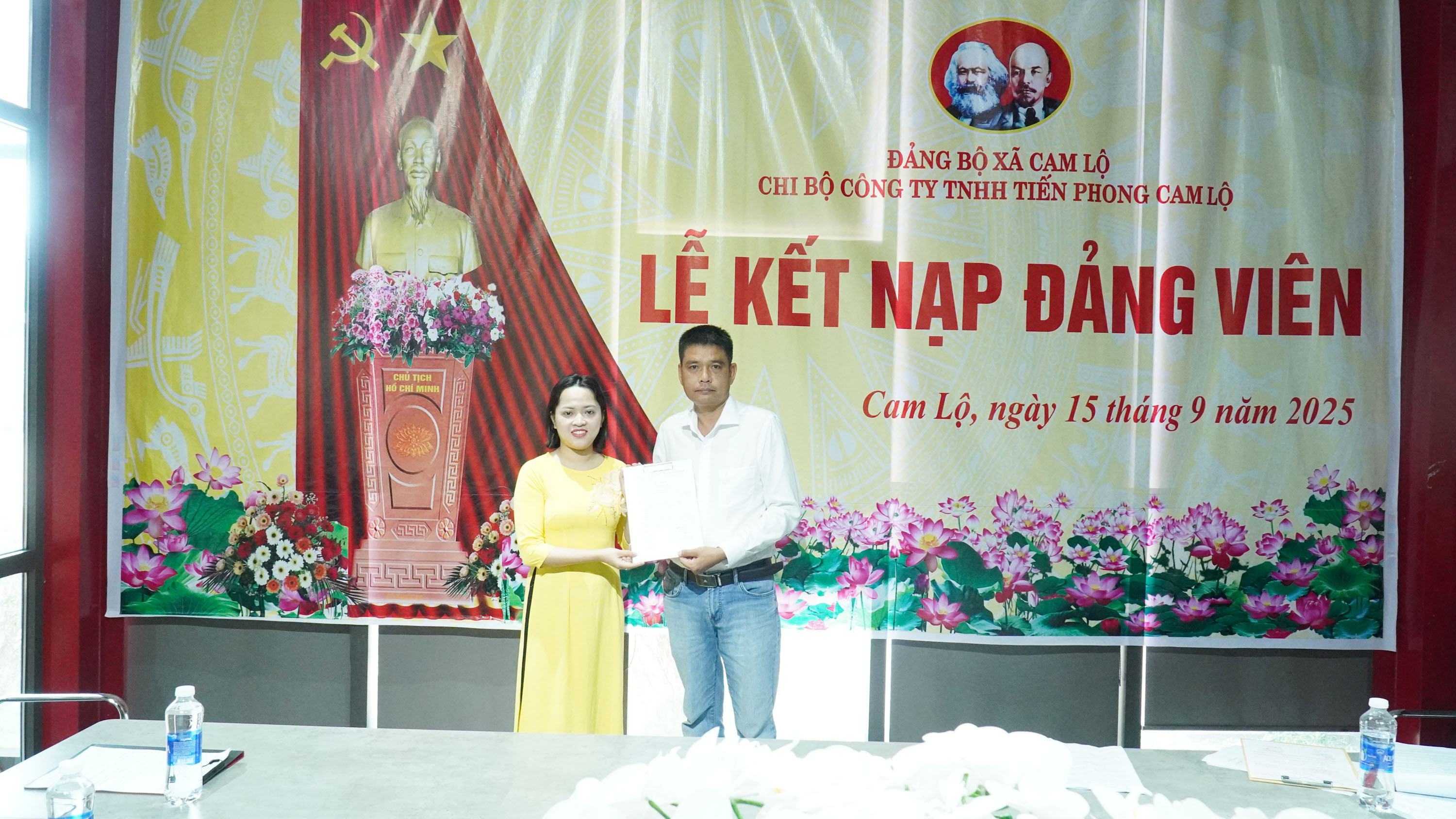 Chiều 15/9/2025, Chi bộ Công ty TNHH Tiến Phong Cam Lộ tổ chức Lễ kết nạp đảng viên cho các quần chúng ưu tú. Dự lễ có đồng chí Lê Anh Chương, UVBTV Đảng ủy, Phó Chủ tịch UBND xã Cam Lộ.