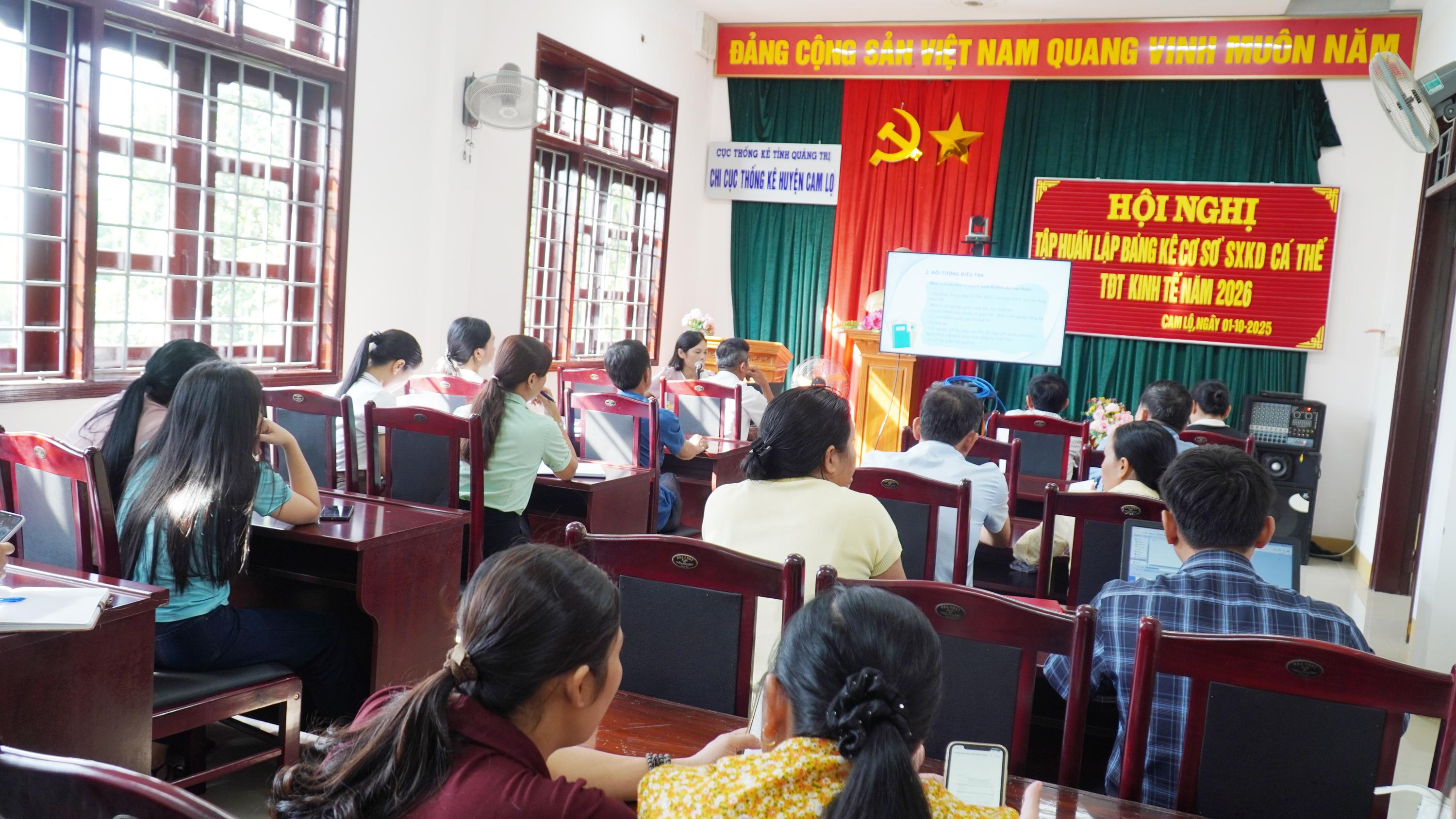 Ngày 1/10/2025, tại xã Cam Lộ, Cục Thống kê tỉnh Quảng Trị đã tổ chức hội nghị tập huấn lập bảng kê cơ sở sản xuất kinh doanh cá thể Tổng điều tra kinh tế năm 2026 cho các cán bộ điều tra viên hai xã Cam Lộ và Hiếu Giang. Dự hội nghị có đồng chí Lê Anh Chương, Phó Chủ tịch UBND xã Cam Lộ; đồng chí Phạm Viết Thanh, Phó Chủ tịch UBND xã Hiếu Giang.