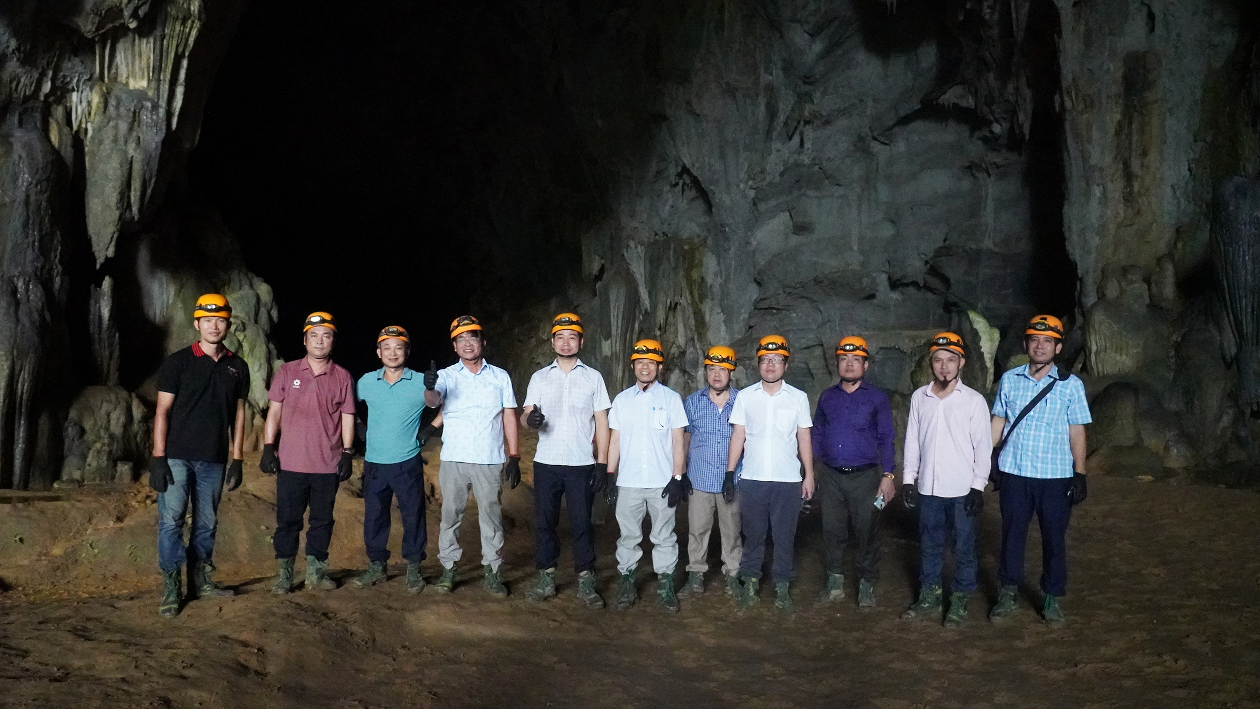Đoàn công tác đi thuyền qua sông để vào khám phá Hang Chuột ở Tú Làn