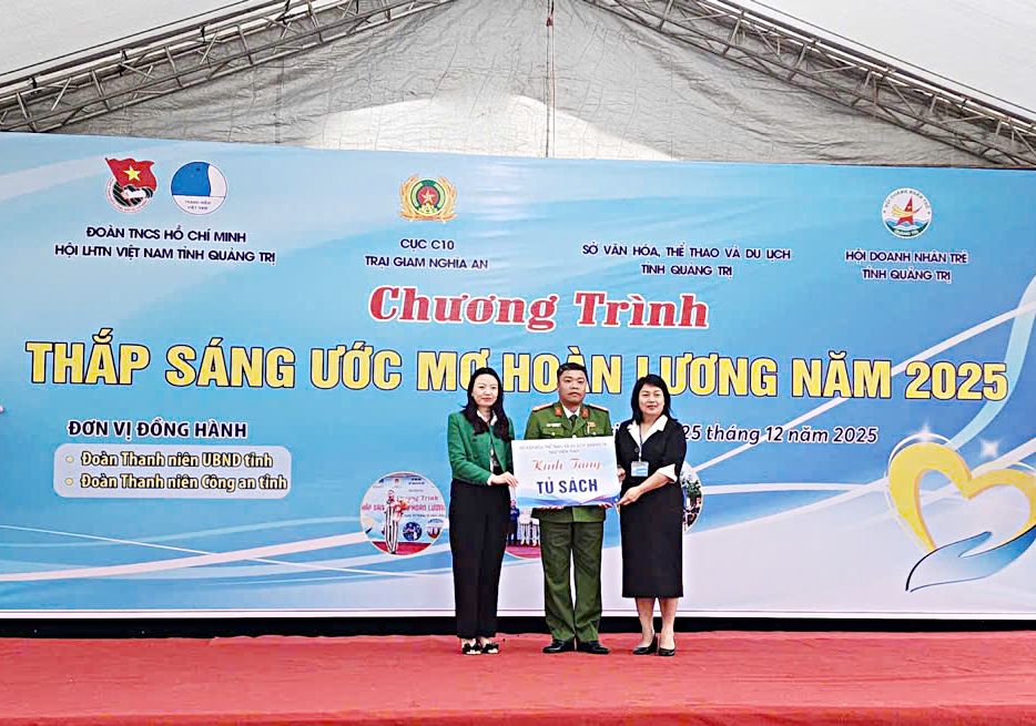 Sáng nay 25/12/2025, tại Phân trại số 3, Trại giam Nghĩa An, Cục C10 Bộ Công an (đóng ở xã Cam Lộ, tỉnh Quảng Trị), Đoàn Thanh niên - Hội LHTN Việt Nam tỉnh, Trại giam Nghĩa An, Sở Văn hóa, Thể thao và Du lịch, Hội Doanh nhân trẻ tỉnh Quảng Trị phối hợp tổ chức chương trình Thắp sáng ước mơ hoàn lương năm 2025 cho phạm nhân đang chấp hành án phạt tù tại Trại giam Nghĩa An.