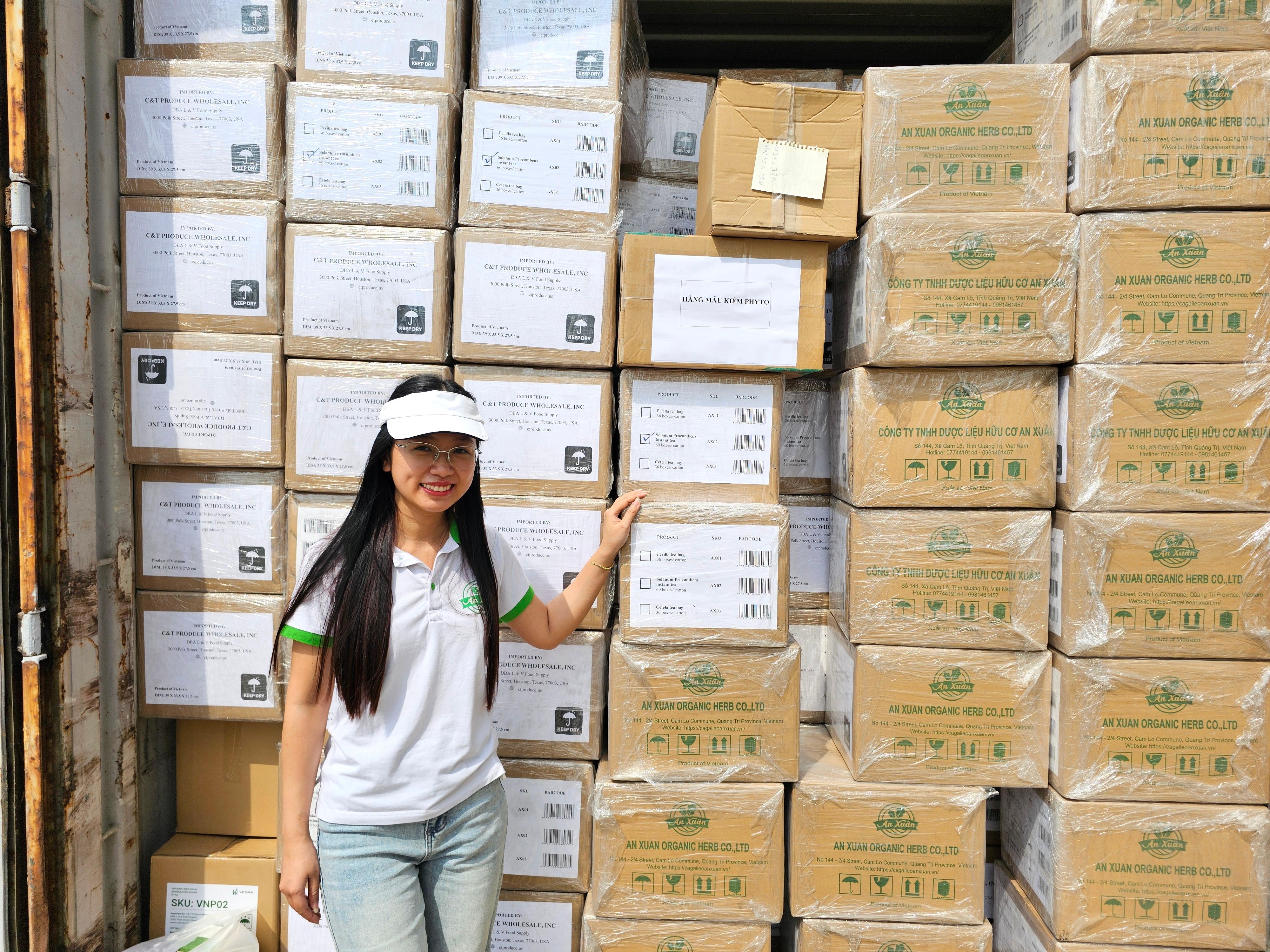 Sản phẩm của Công ty TNHH Dược liệu hữu cơ An Xuân được bốc xếp lên container để xuất khẩu sang Mỹ