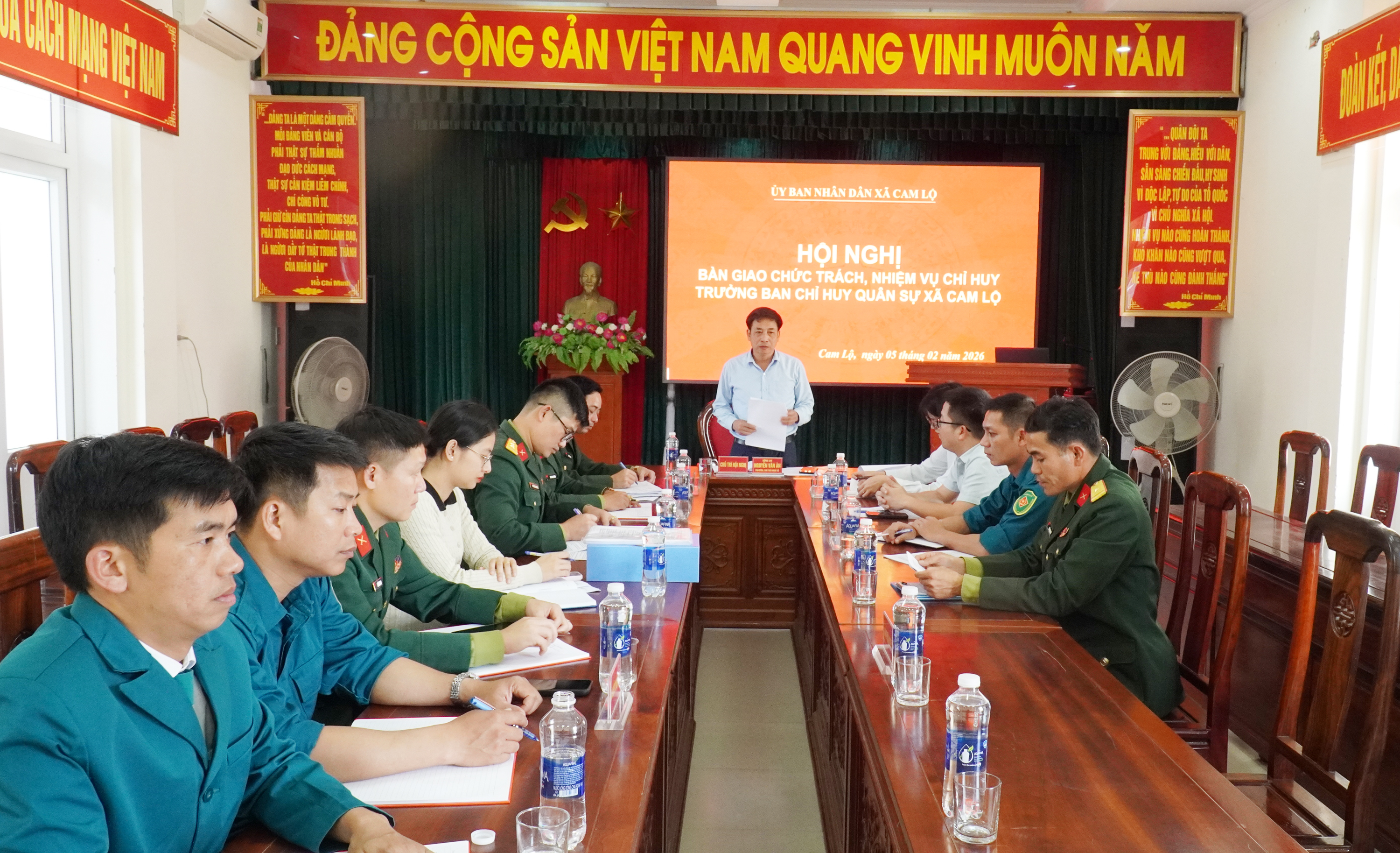 Chiều ngày 5/2/2026, UBND xã Cam Lộ tổ chức Hội nghị bàn giao chức trách, nhiệm vụ Chỉ huy trưởng Ban Chỉ huy quân sự xã Cam Lộ. Đồng chí Nguyễn Văn Ân, Phó Bí thư Đảng ủy, Chủ tịch UBND xã chủ trì hội nghị. Tham dự hội nghị có đồng chí Nguyễn Thị Hoàng Oanh, Phó Bí thư Thường trực Đảng ủy xã, cùng đại diện các phòng, ban, đoàn thể liên quan và Ban Chỉ huy quân sự xã.