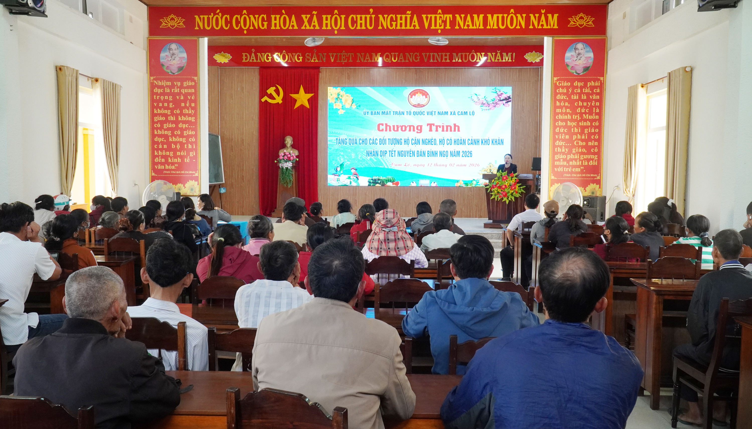 Ngày 12/2, Ủy ban MTTQ Việt Nam xã Cam Lộ tổ chức chương trình trao quà Tết Nguyên đán Bính Ngọ 2026 cho các hộ nghèo, hộ cận nghèo và gia đình có hoàn cảnh khó khăn trên địa bàn xã. Tham dự chương trình có đồng chí Dương Thị Thương, UVBTV Đảng ủy, Chủ tịch Ủy ban MTTQ Việt Nam xã.