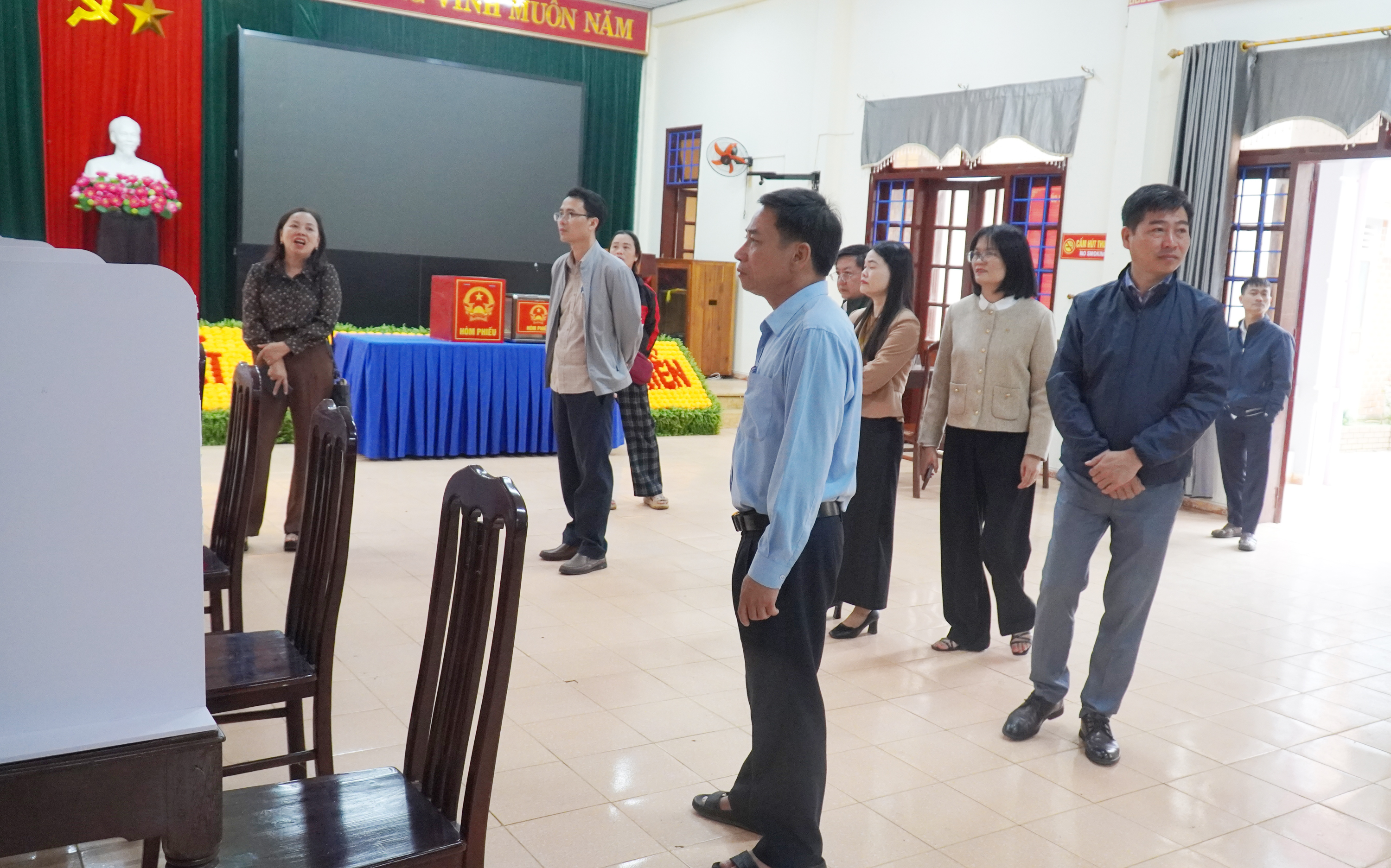 Bên cạnh đó, đoàn cũng kiểm tra việc bố trí các khu vực phục vụ cử tri như bàn hướng dẫn, nơi đặt hòm phiếu, khu vực viết phiếu bầu; công tác tuyên truyền để người dân nắm rõ quyền và nghĩa vụ của mình khi tham gia bầu cử.